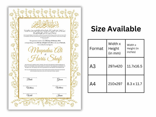 Gold Floral Nikkah Certificate Digital Download Personalised, A4, A3, Template, Instat Download. NN206