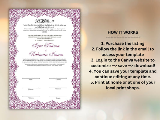 Nikkah Certificate Digital Download Personalised, A4, A3, Template, Editable, Purple Nikkah Nama, Nikkah Contract, Muslim Contract. NN244