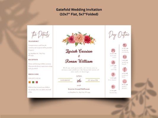 Gatefold Wedding Invitation Template with Itinerary | Floral Boho Wedding Invite | RSVP & Timeline Card | Printable Digital Download. WI165