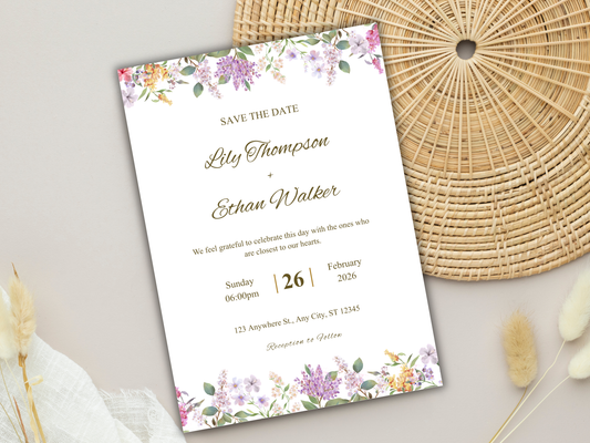 Lavender Wedding Invitation Template, Elegant Floral Itinerary Invite, Rustic Garden Wedding Suite, Editable Purple Flower Invitation.WI178