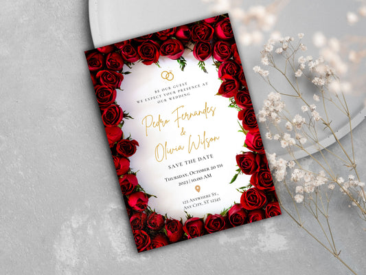 Red Rose Wedding Invitation , dark red floral gold frame border invite, Elegant Red Rose wedding Invitation, ,Shimmey, Editable