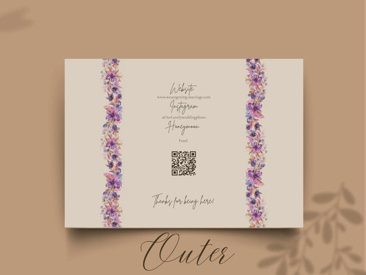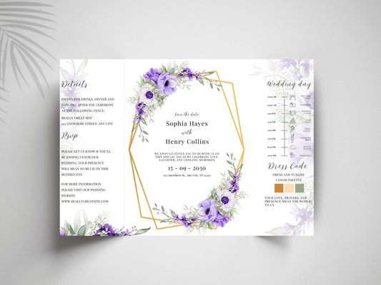 Floral Gatefold Wedding Invitation | Timeline Wedding Card | Modern Purple and Gold Details | Printable Schedule & Reception Invite. WI163