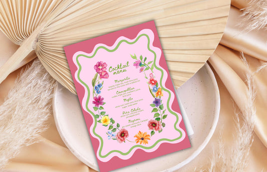 Colorful Floral Cocktail Menu Template, Printable Drinks Sign, Bar Menu Garden Party, Drink Menu, Biotical Wavy Cocktail Menu. WSB39