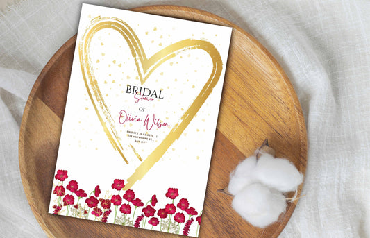 Red bridal shower invitation template, Red Wild Flower and Gold Heart invitation, 5 x 7 Editable Canva Template, Printable, B36