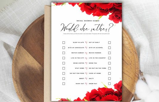 Red Rose Wedding Shower Game, Modern Bridal Shower Game, Editable Text, Modern Editable Game Card, WS47