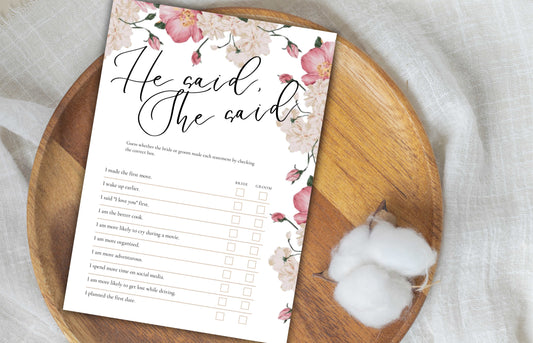 Bridal Shower Games, Pink Rose Bridal Shower Games, He Said She Said Bridal Shower Game, Pink Flower Bridal Shower Editable Game. WS51