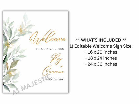Green Leaves Wedding Welcome Sign Template, Greenery wedding welcome sign printable, Wedding welcome sign download. WS10