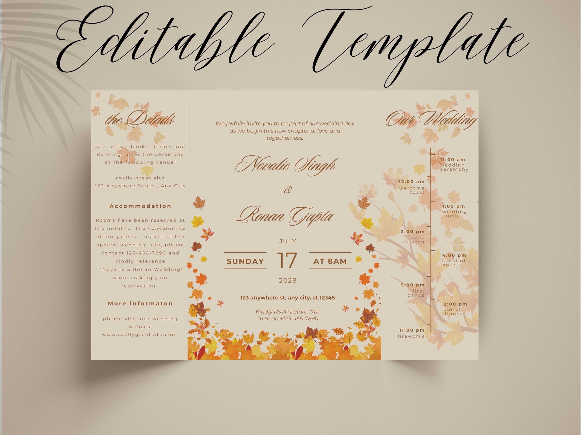 Autumn Wedding Card Template | Fall Leaves Wedding Details Card | Editable Timeline Program | Orange Wedding Invitation Printable. 174