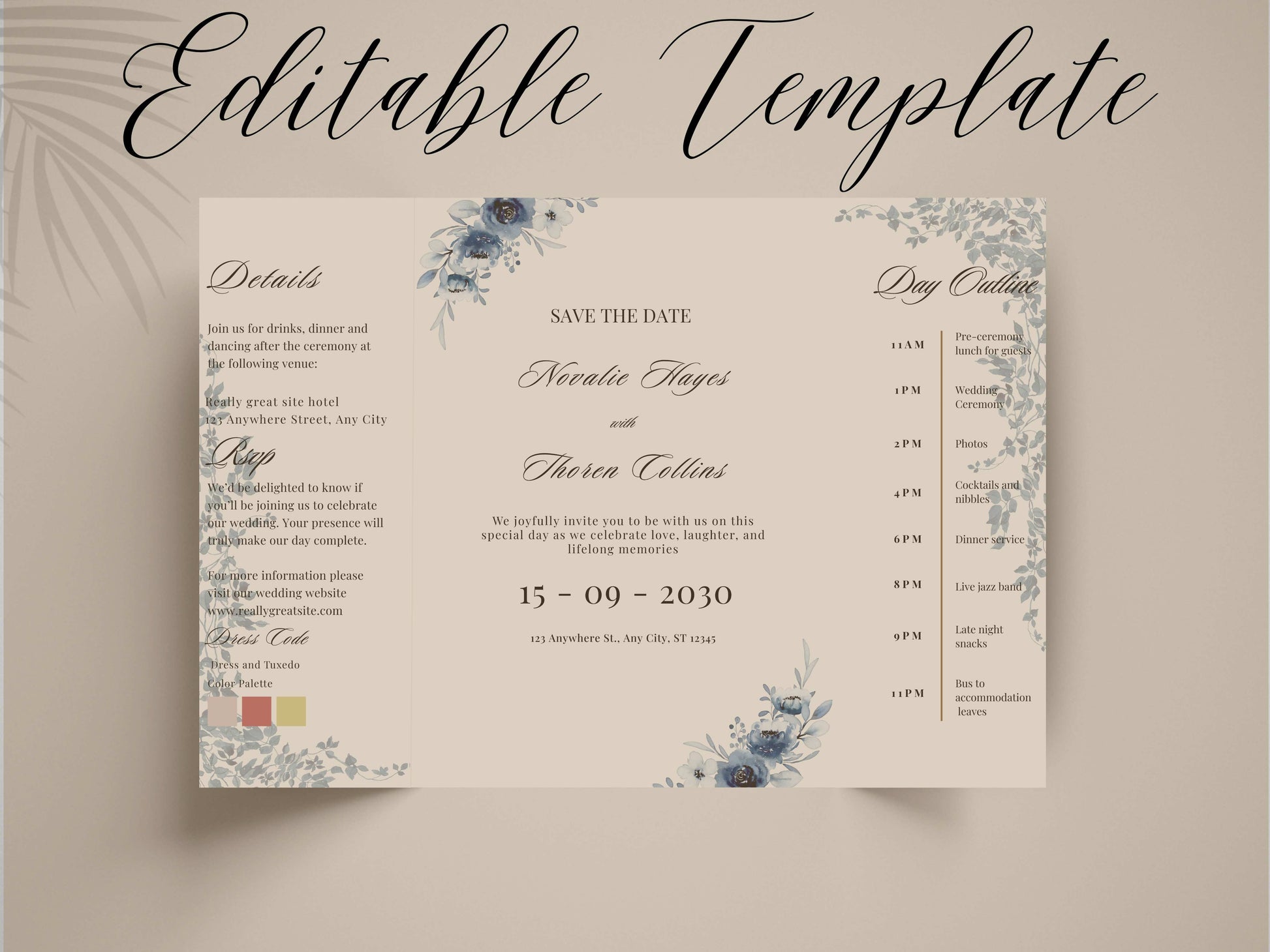Blue Floral Wedding Itinerary Template, Save The Date Schedule Card, Elegant Navy Wedding Day Timeline, Printable Itinerary Invitation.WI175