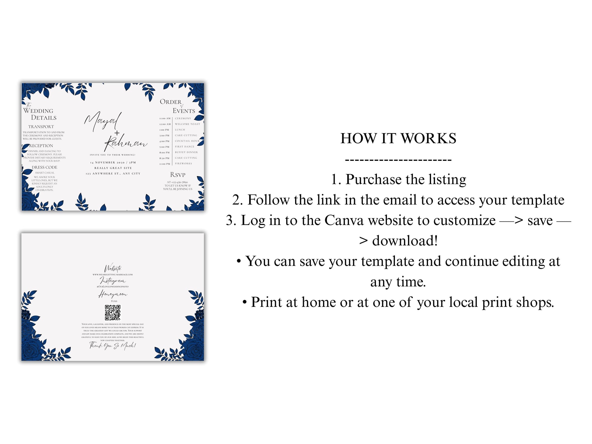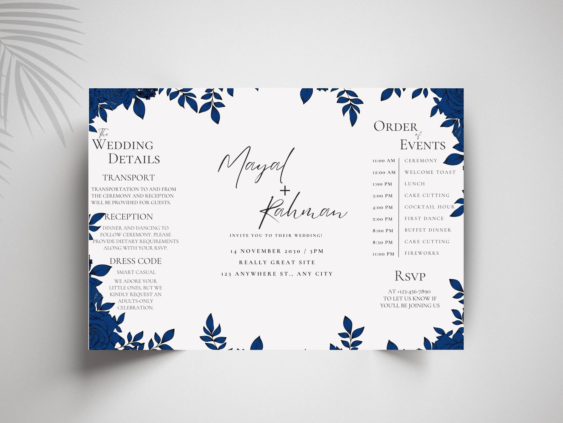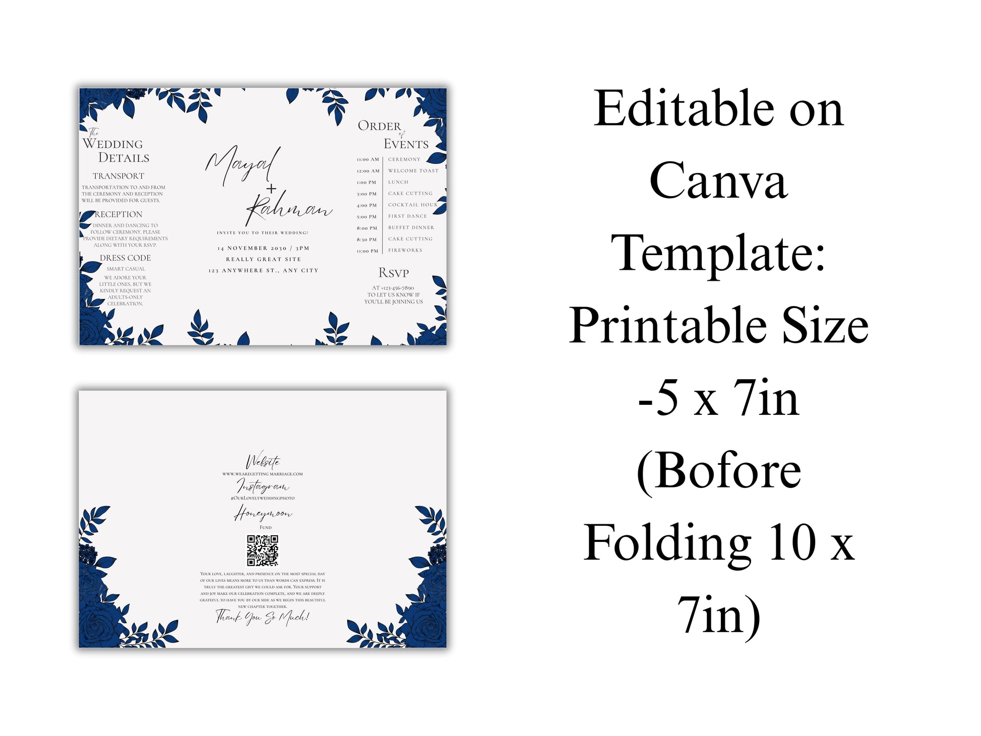 Elegant Gatefold Wedding Invitation | Blue Floral Printable Invite | Modern Ceremony Reception Card | Editable Template. WI133