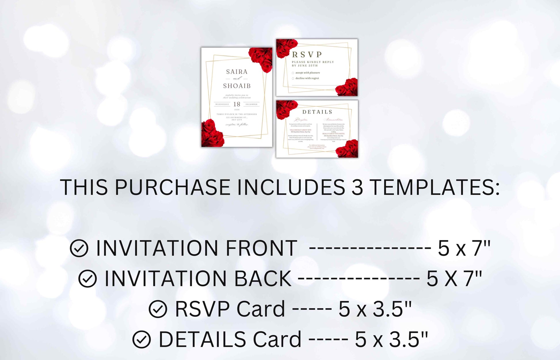 Elegant Red Rose Wedding Invitation Suite, Red Rose Wedding Invitation with Gold Frame, Printable Suite, Burgundy Editable Rsvp. WI99