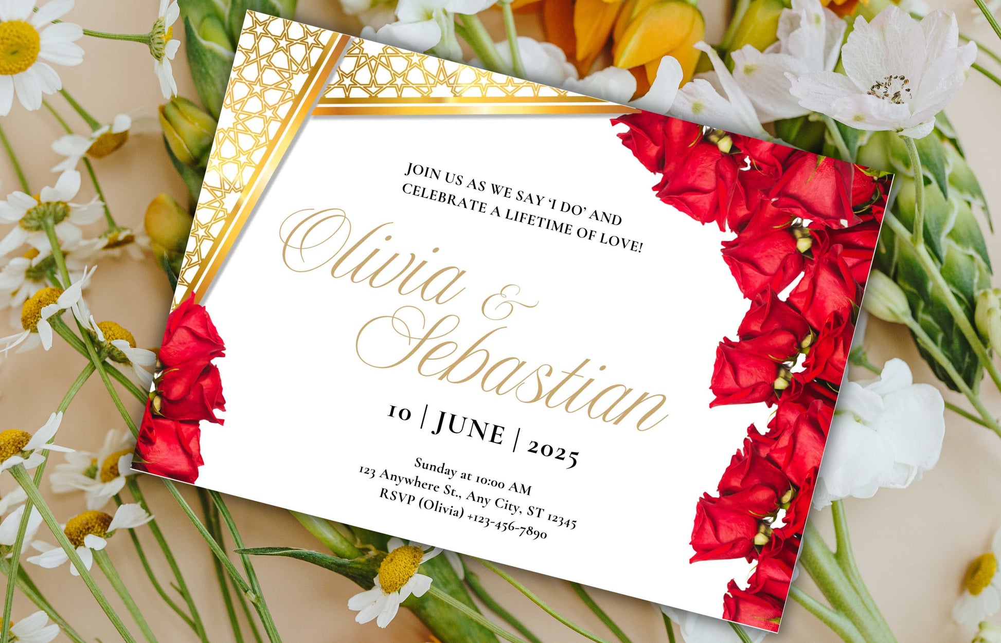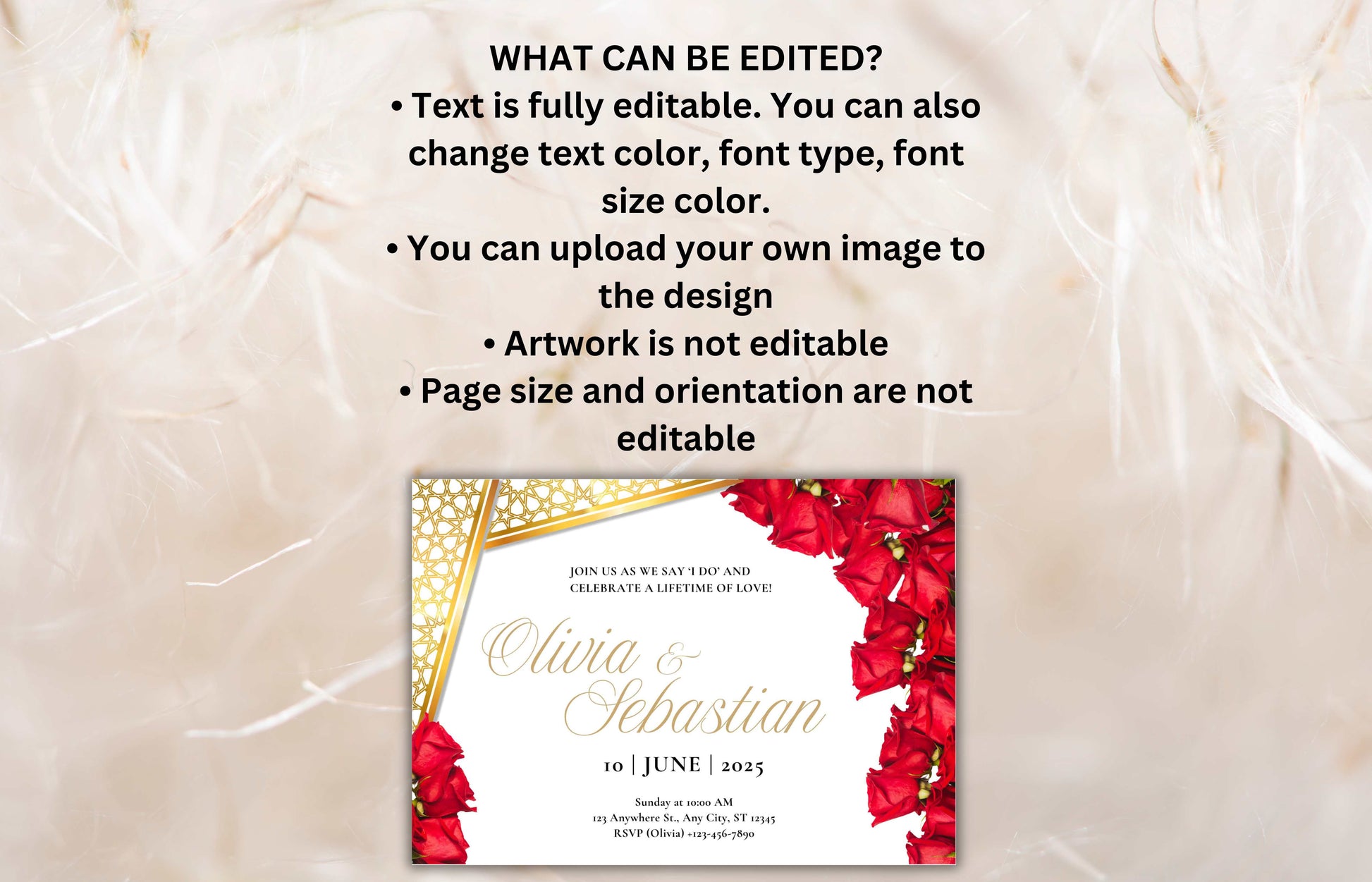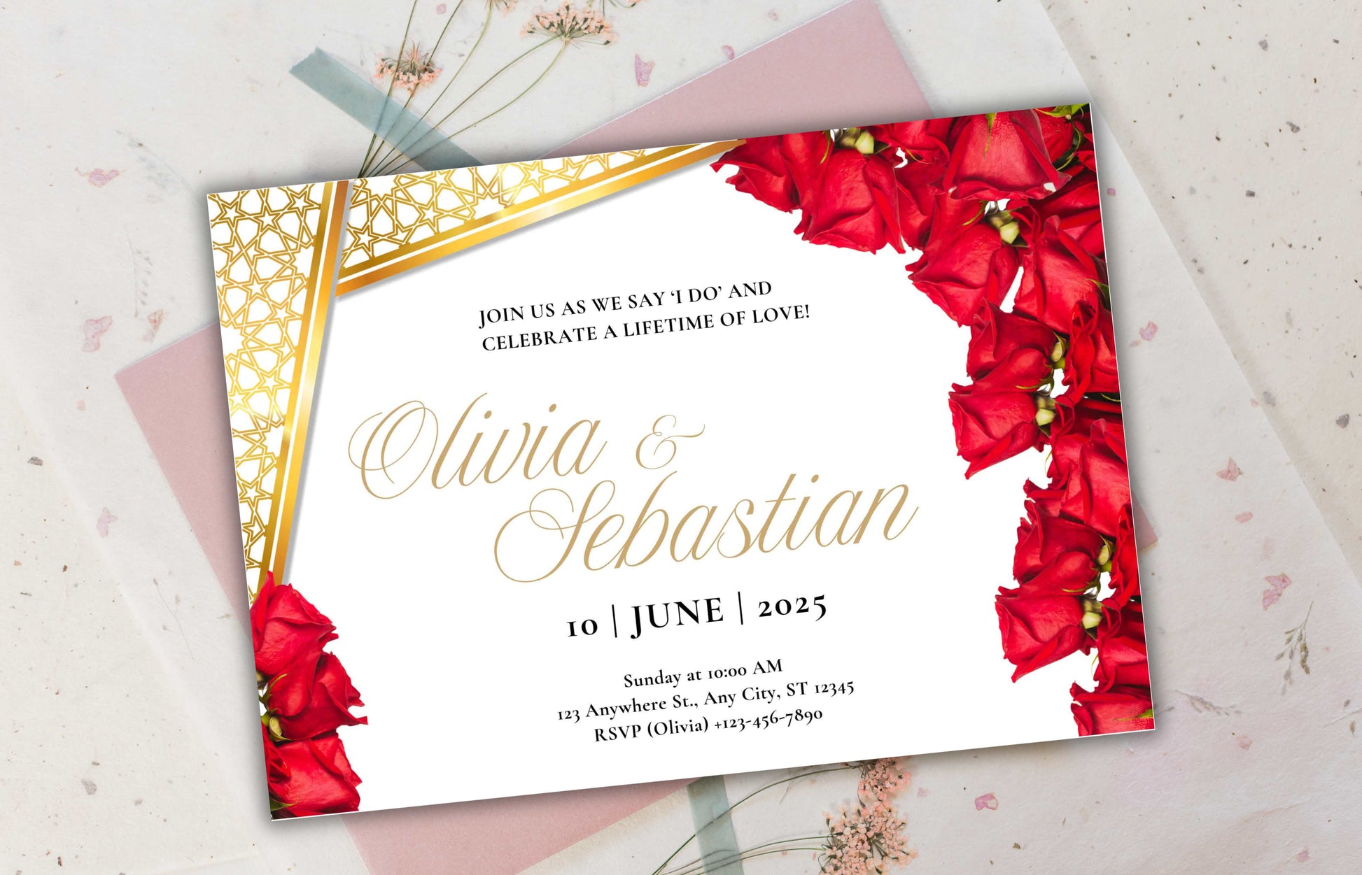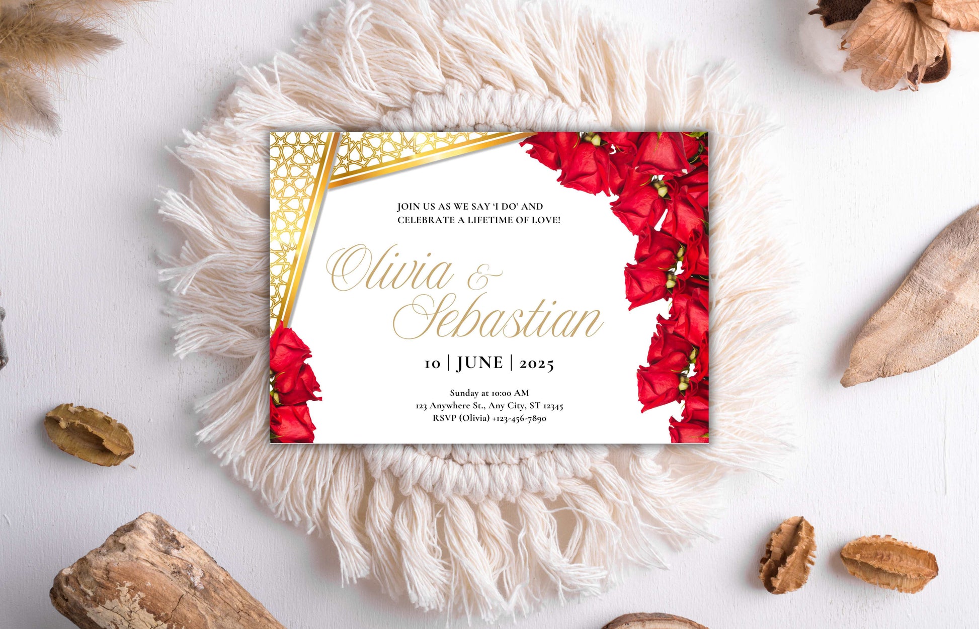 Elegant Red Roses Wedding Invitation - Editable Digital Template for Print - Customizable Romantic Wedding Invitation. WIB74