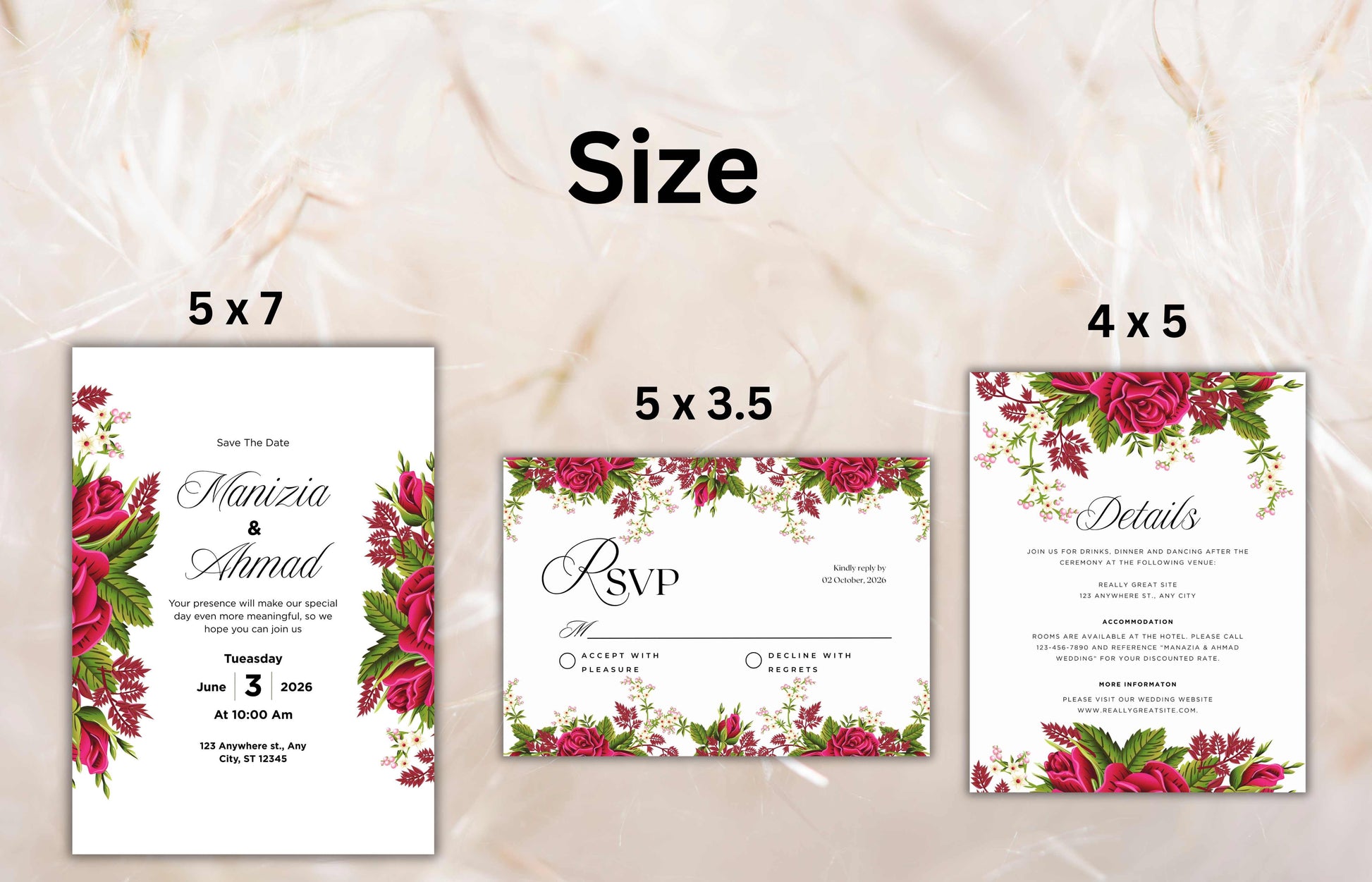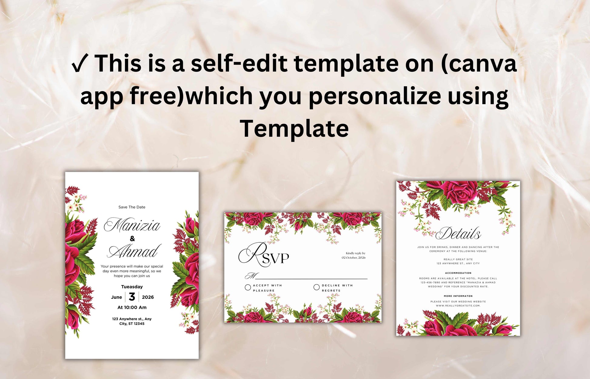 Floral Wedding Invitation Set Template, Printable Hot Pink Rose Wedding Invite Suite, Boho Wedding Template, RSVP Card, Details Card. WIB73