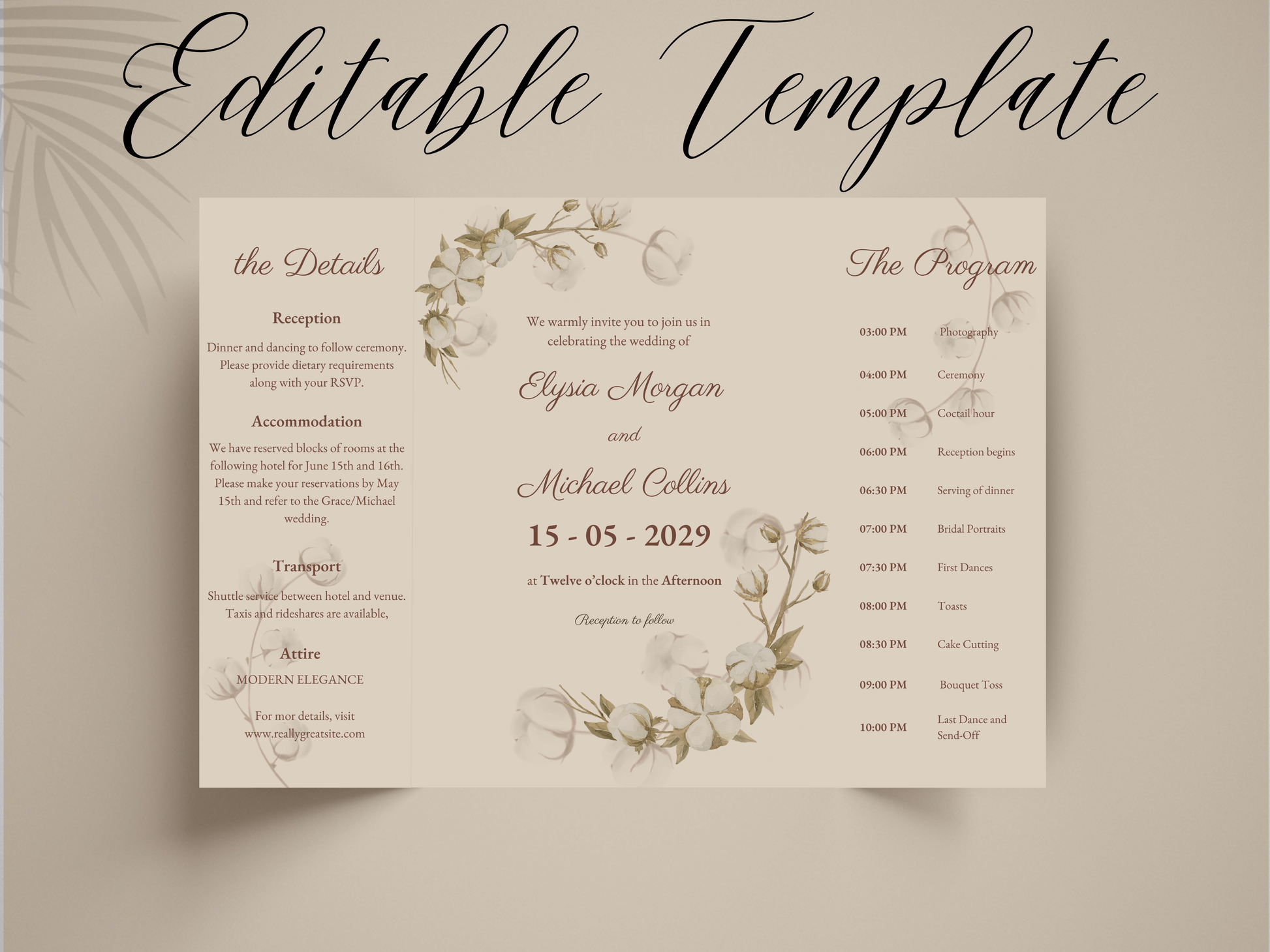 Floral Wedding Invitation Template | Folded Wedding Program & Details Card | Printable Rustic Boho Wedding Invite | Editable Template. WI176