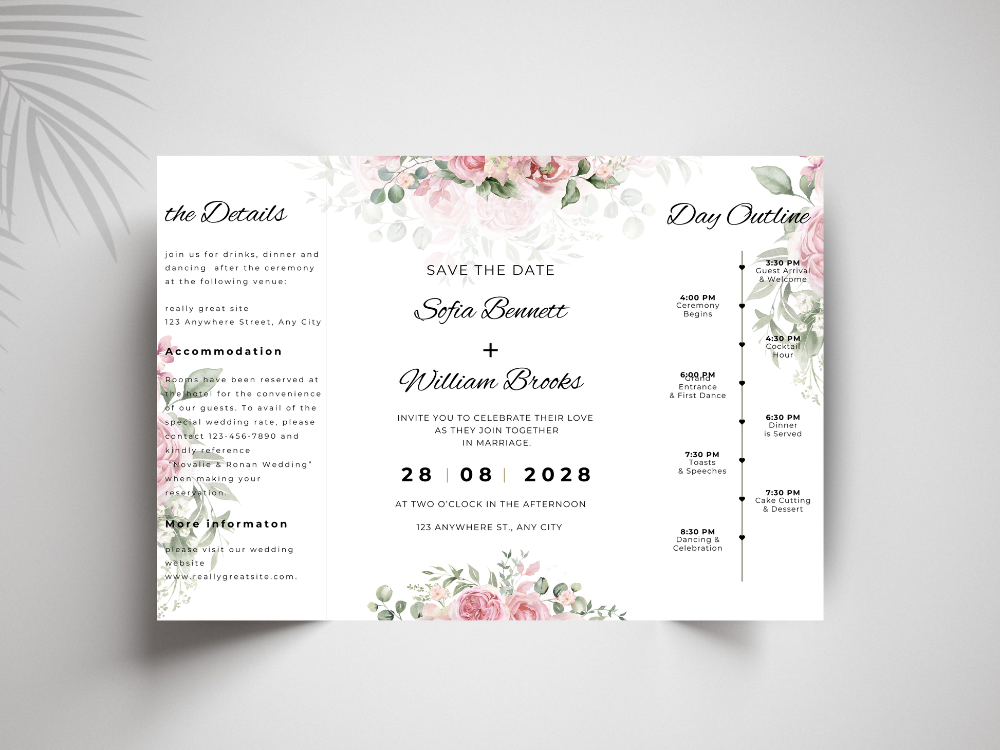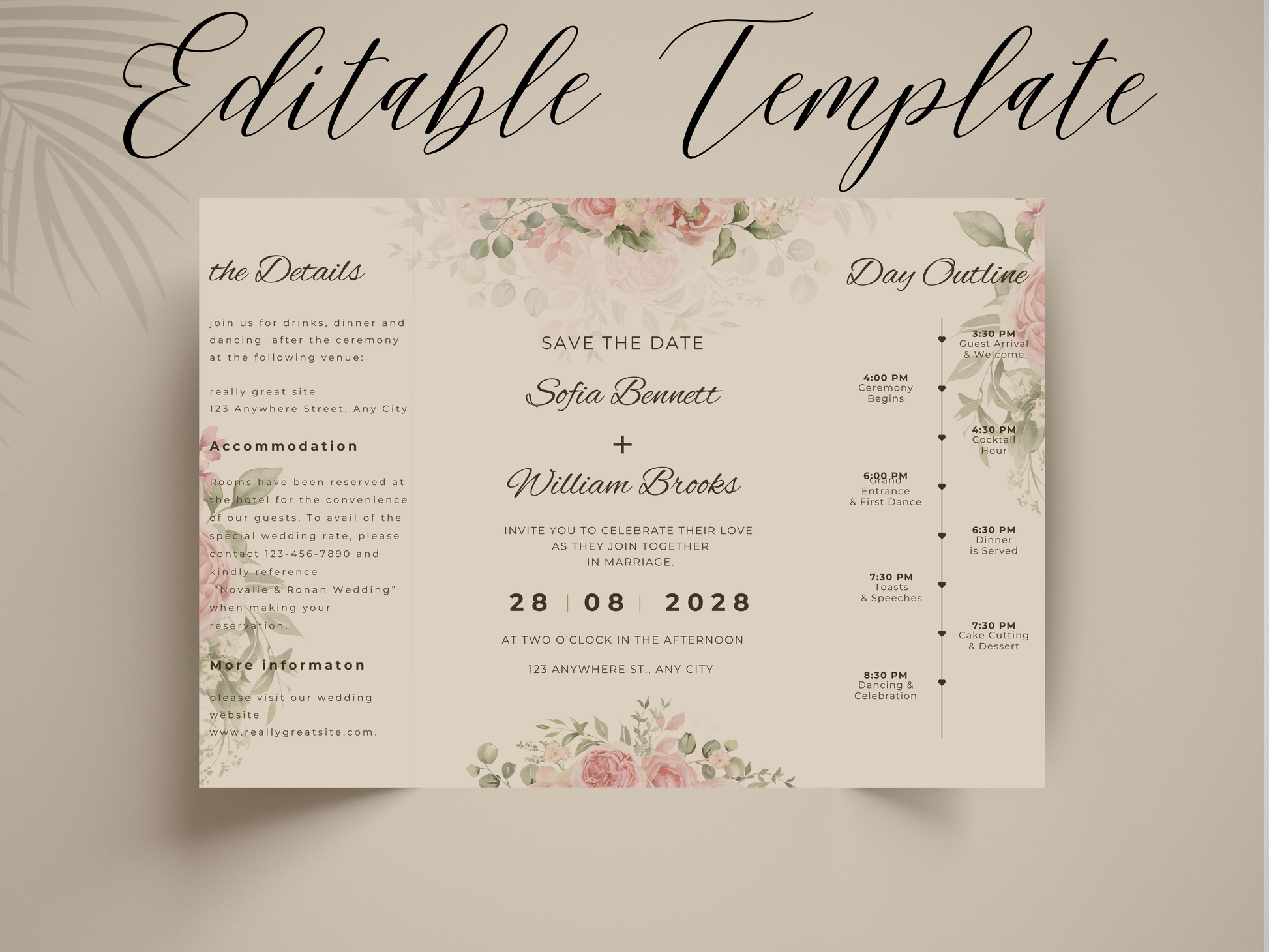 Floral Wedding Itinerary Template, Save the Date Timeline Card, Editable Canva Template, Wedding Day Schedule, Printable Details Card. WI181