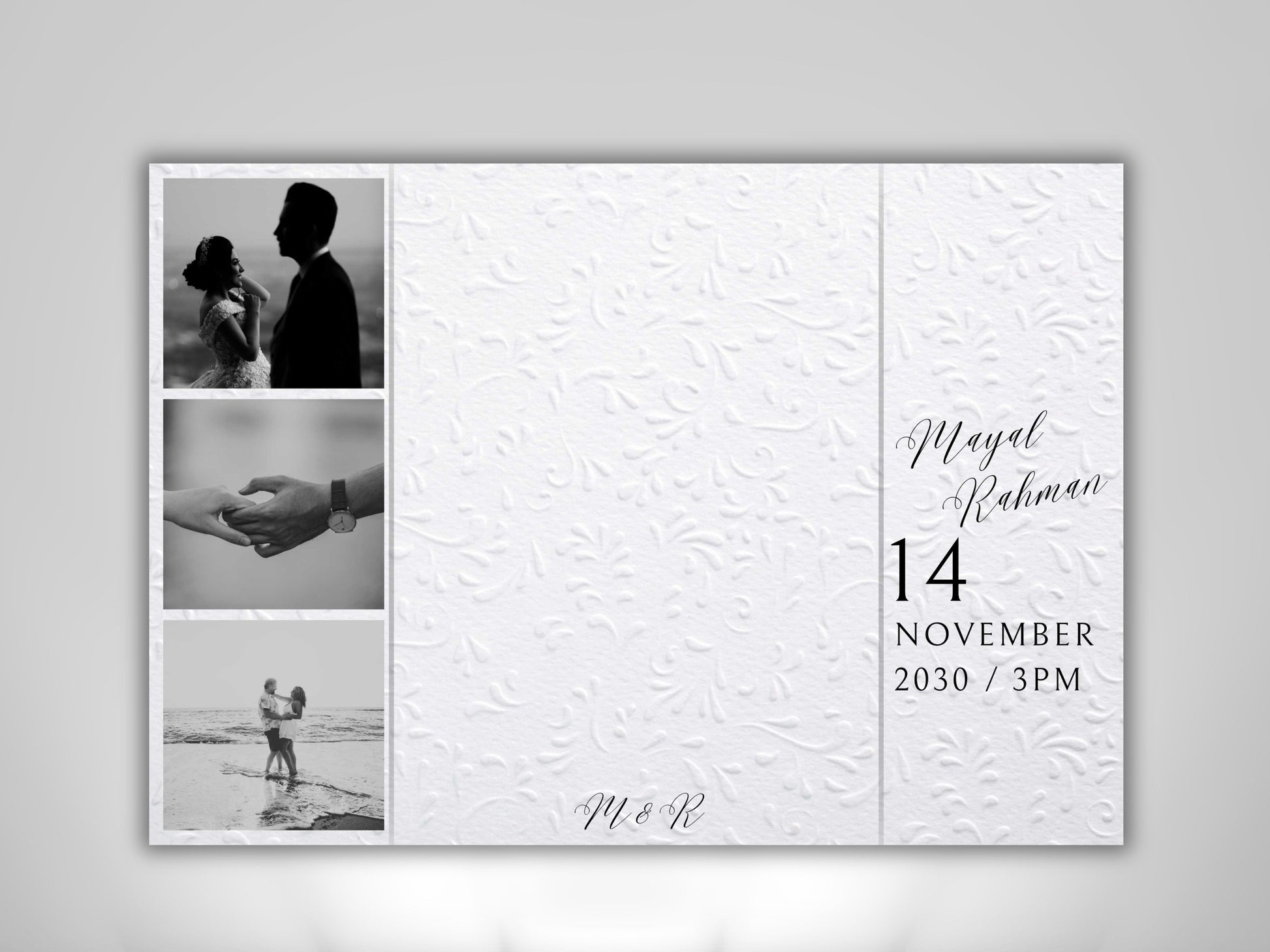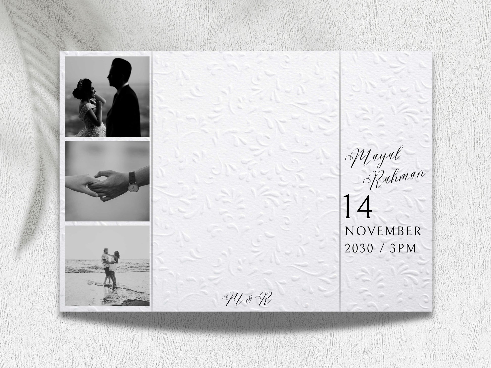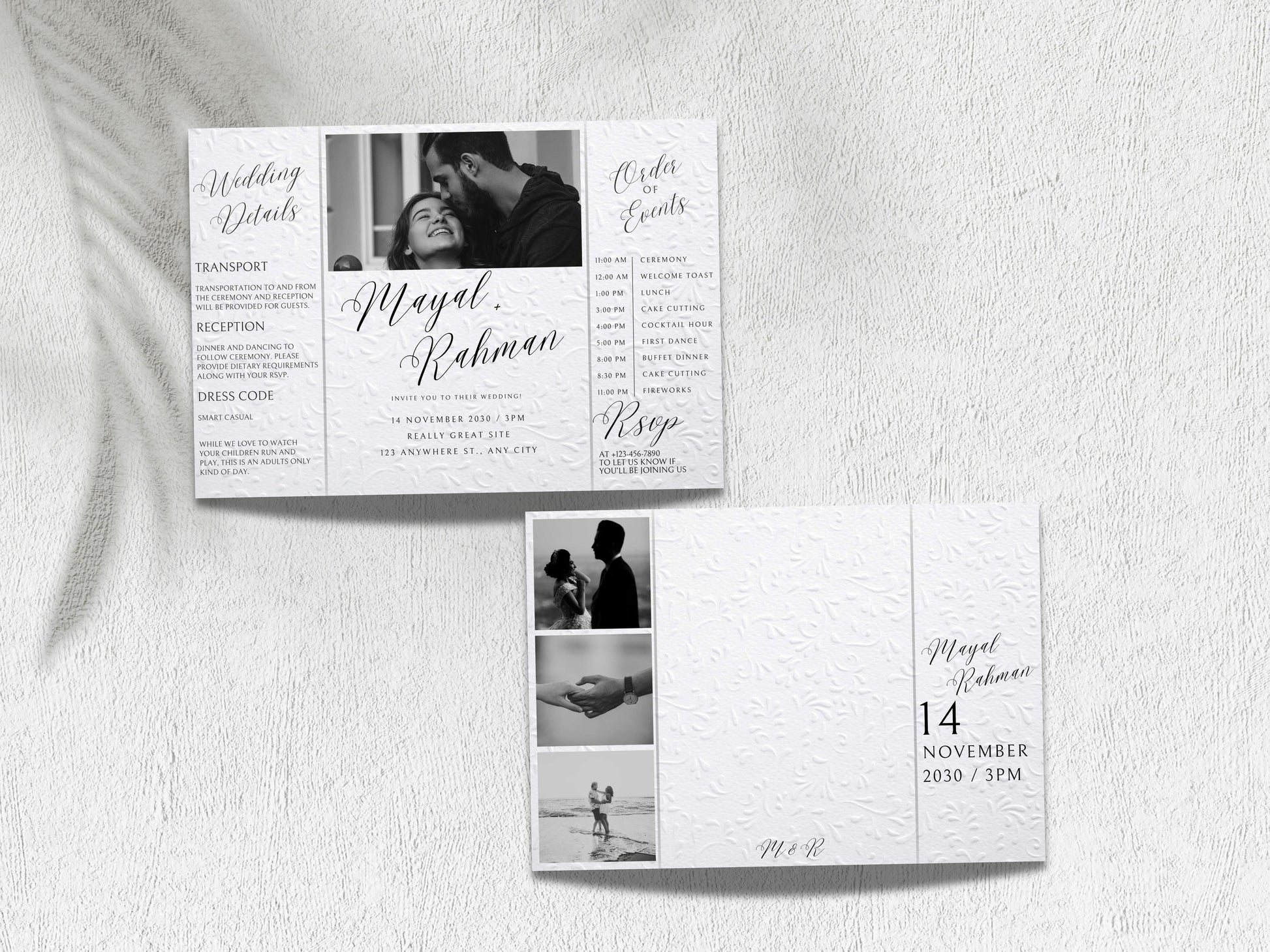 Make a stunning first impression with this gatefold wedding invitation — a modern, romantic design in elegant black and white. Featuring a folded layout with space for your photo, wedding details, RSVP, and a full timeline of the day’s events, this printable template offers both style and practicality.