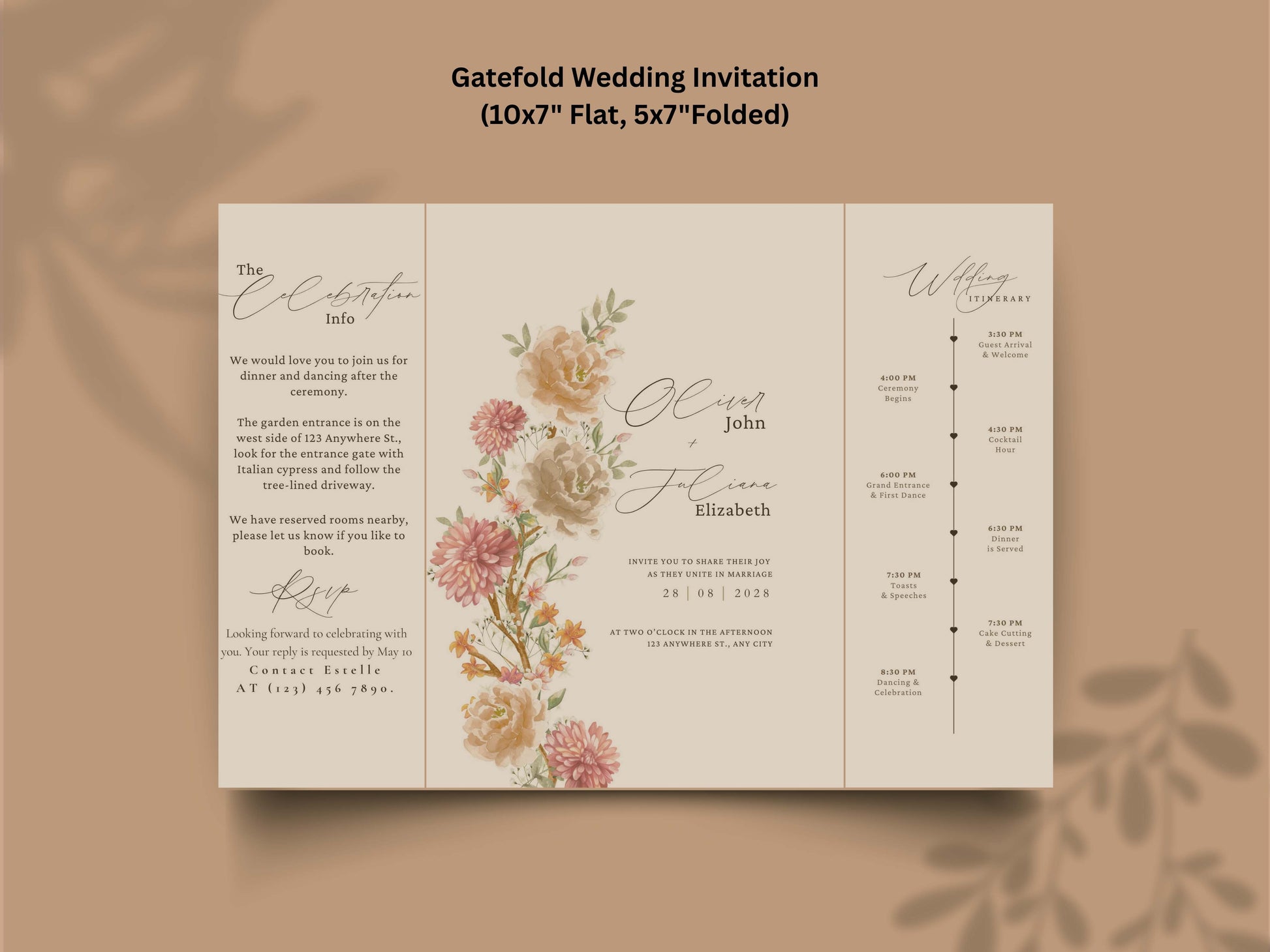 Create a beautiful first impression with this editable gatefold wedding invitation template. Designed with elegant florals, this boho wedding invite is perfect for rustic, garden, or modern wedding themes. The template includes an RSVP card and wedding itinerary timeline for a complete set.