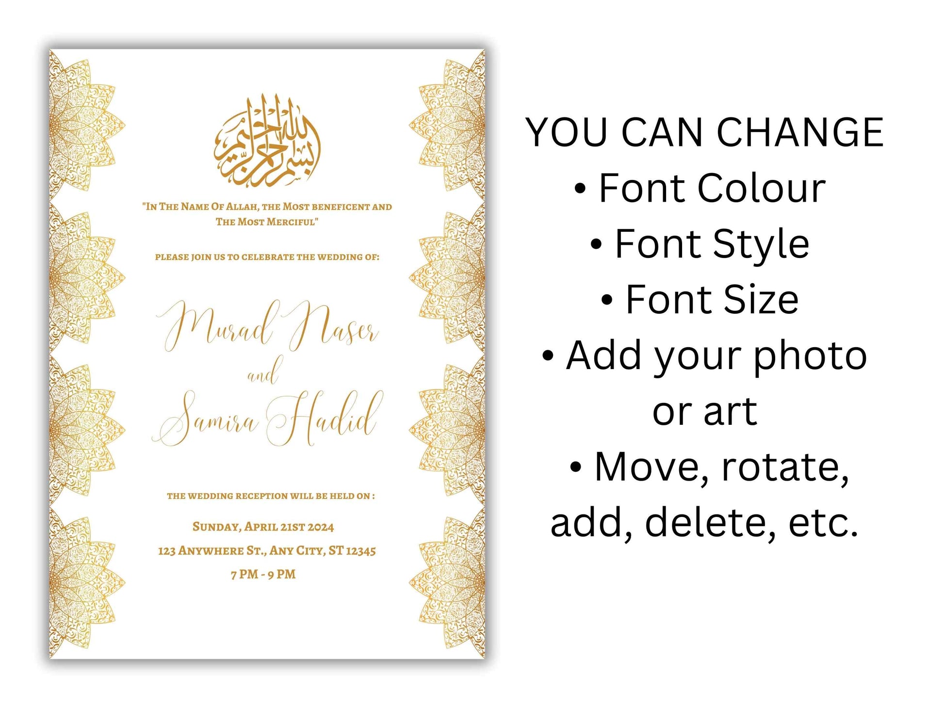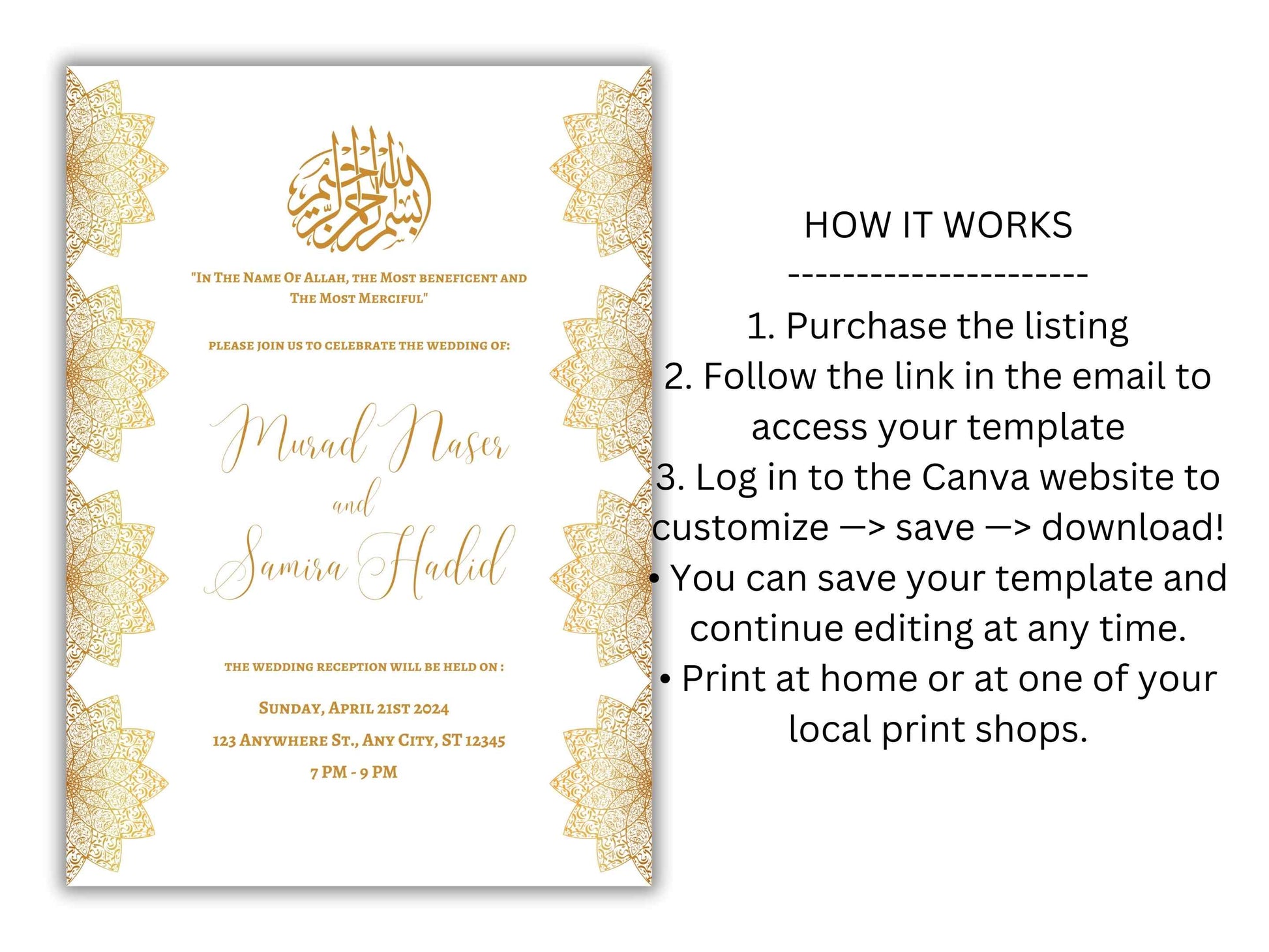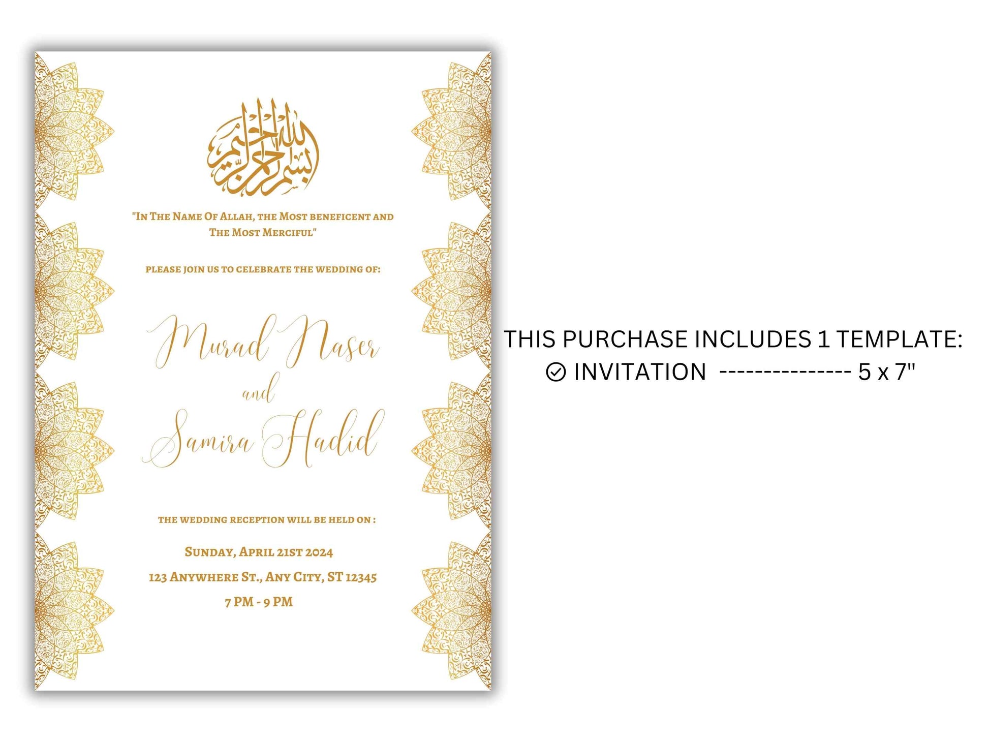 Gold Muslim Wedding Invitation, Nikkah Invitation, Muslim Wedding Invite, Wedding Invite, Invitation Template, Editable Canva Template, WT55