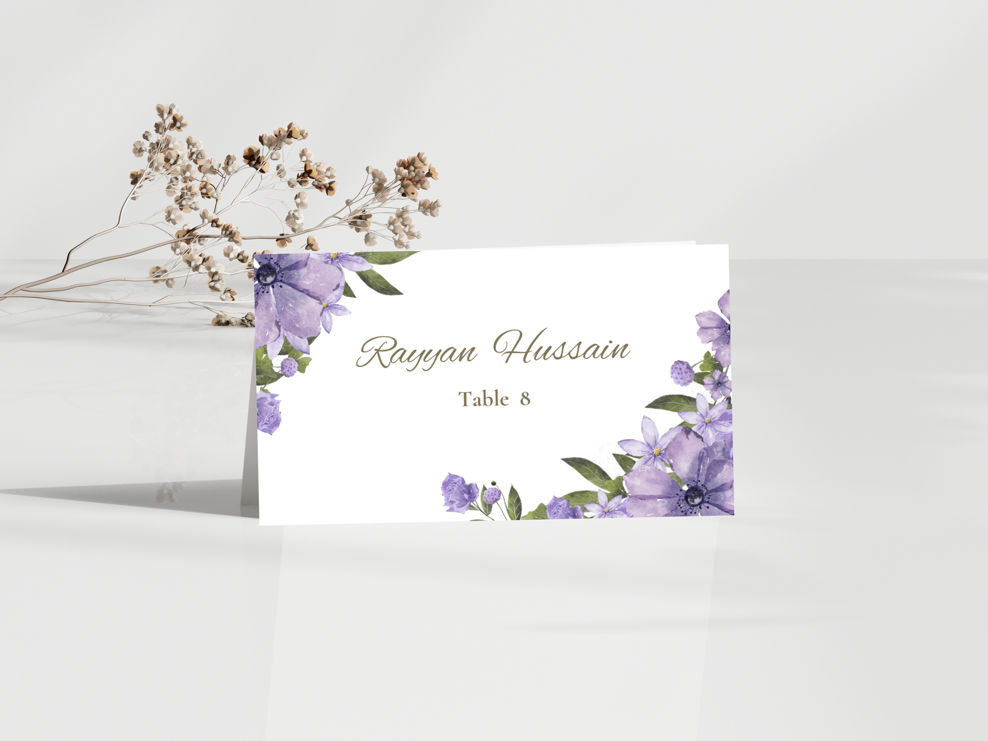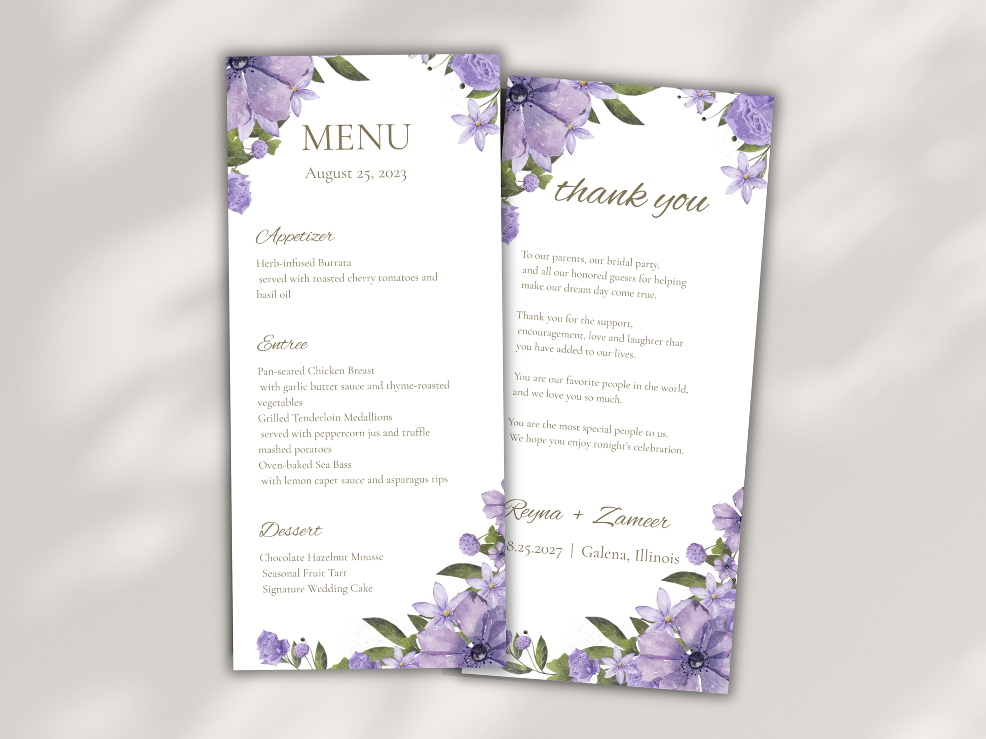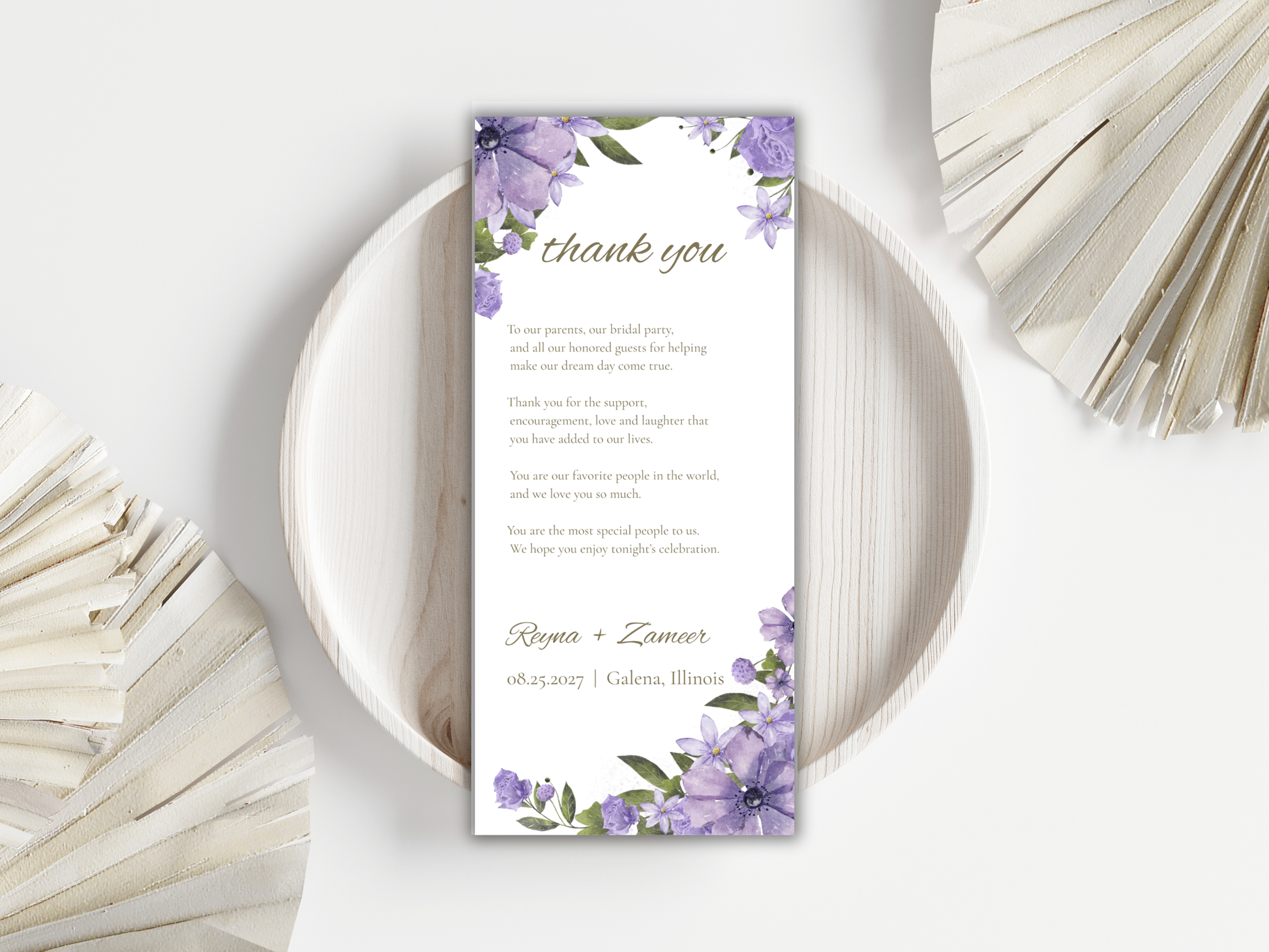 Lavender Floral Wedding Menu & Thank You Template | Editable Canva Place Card. WI204