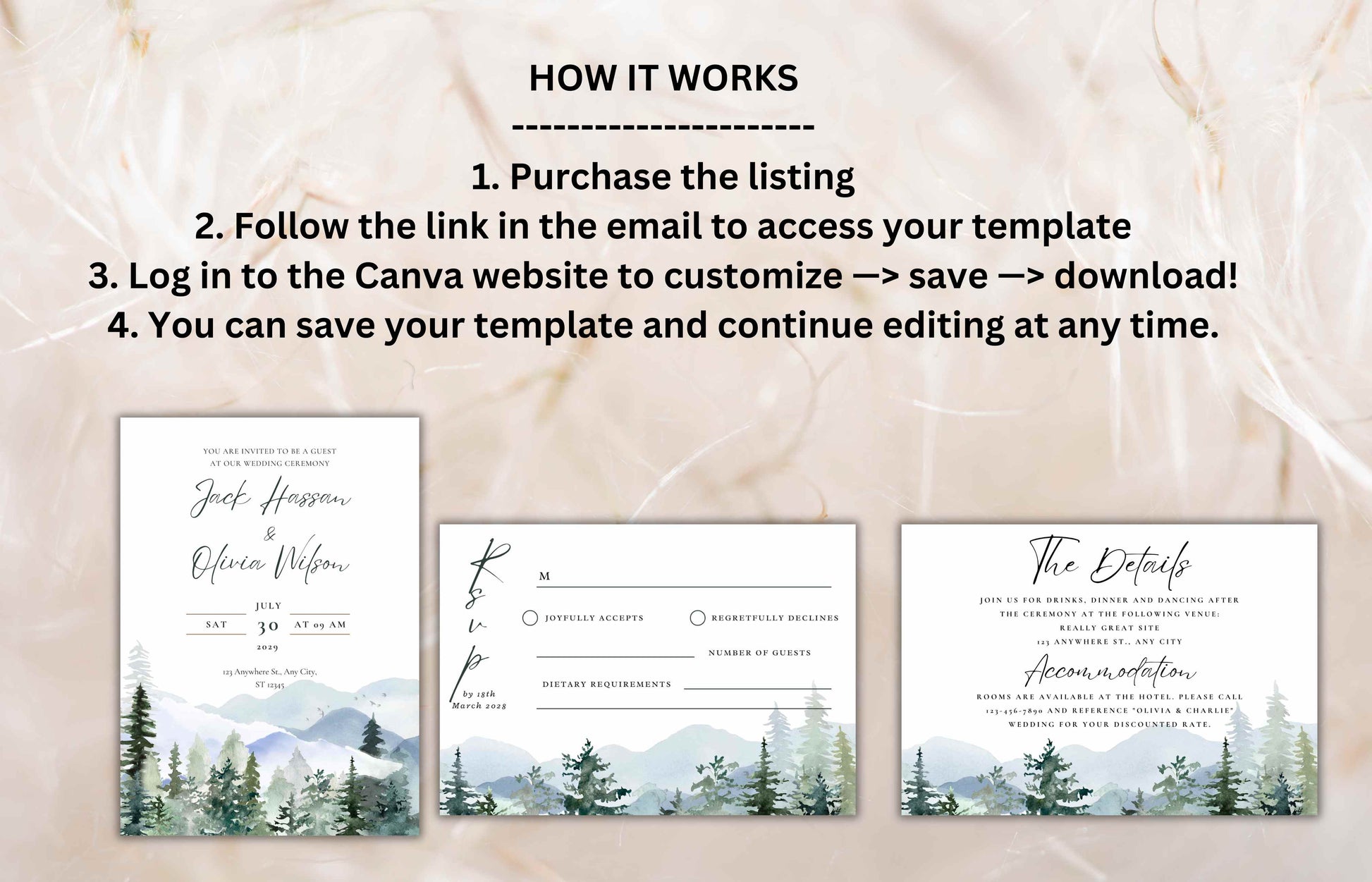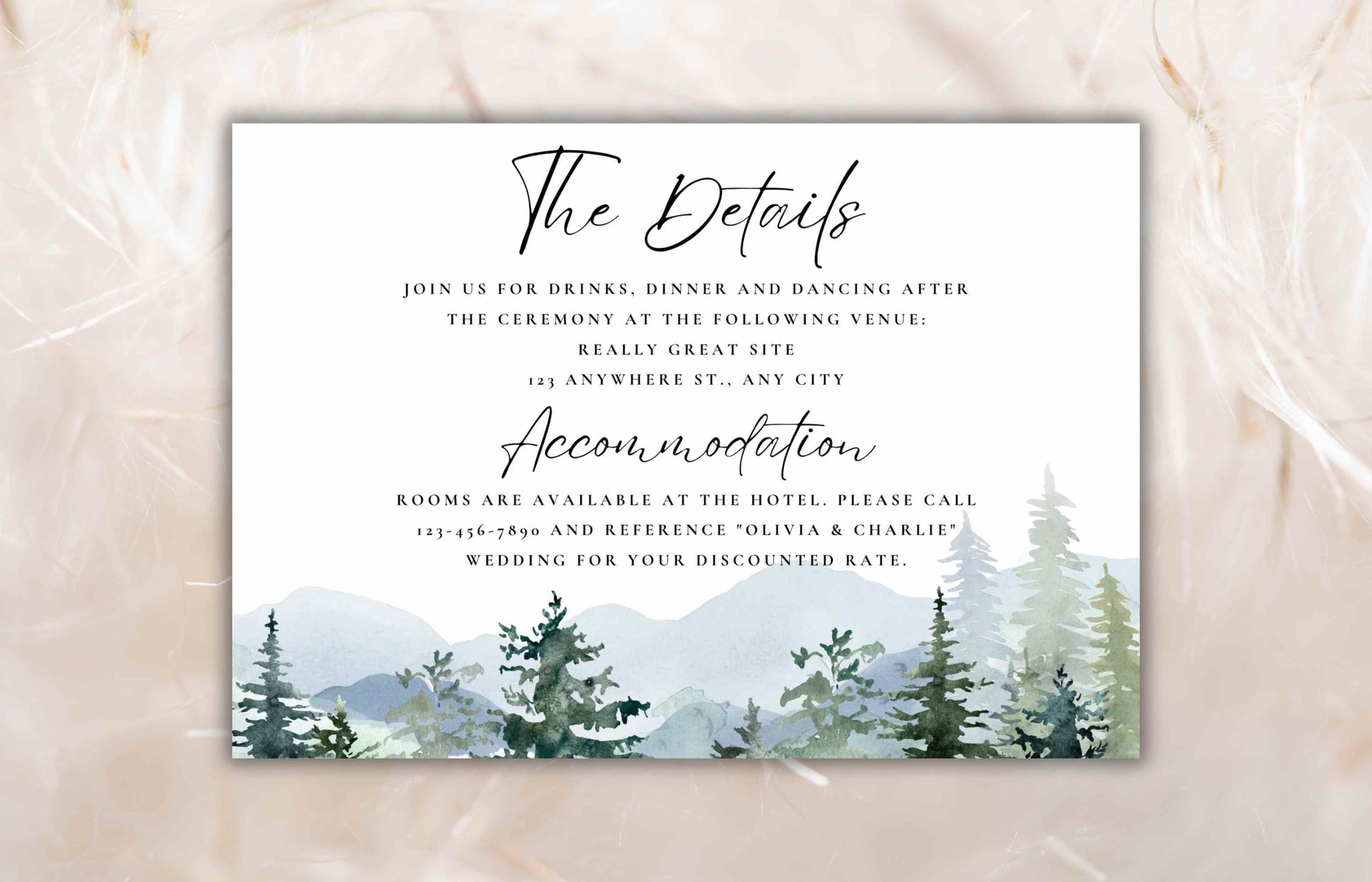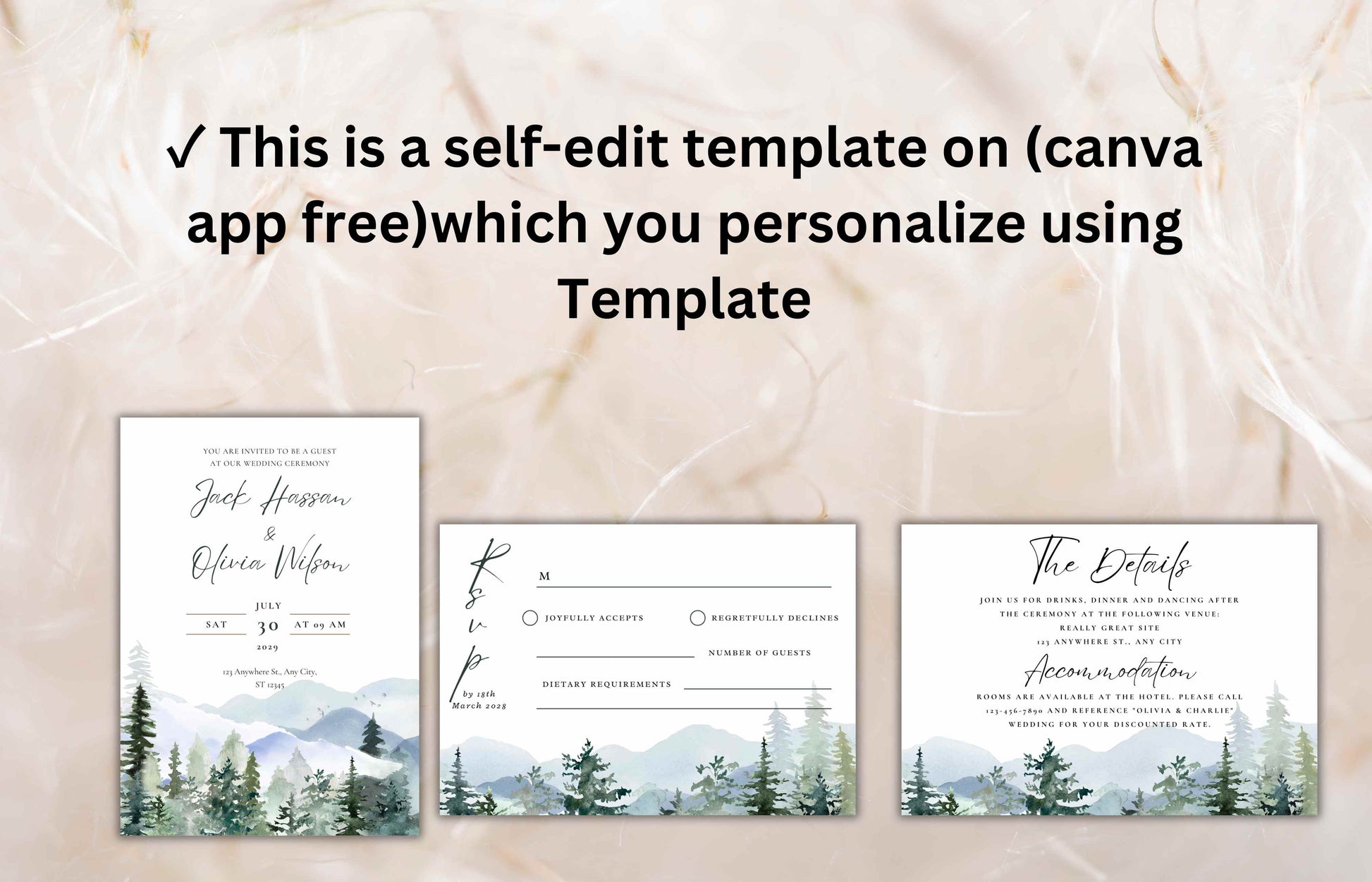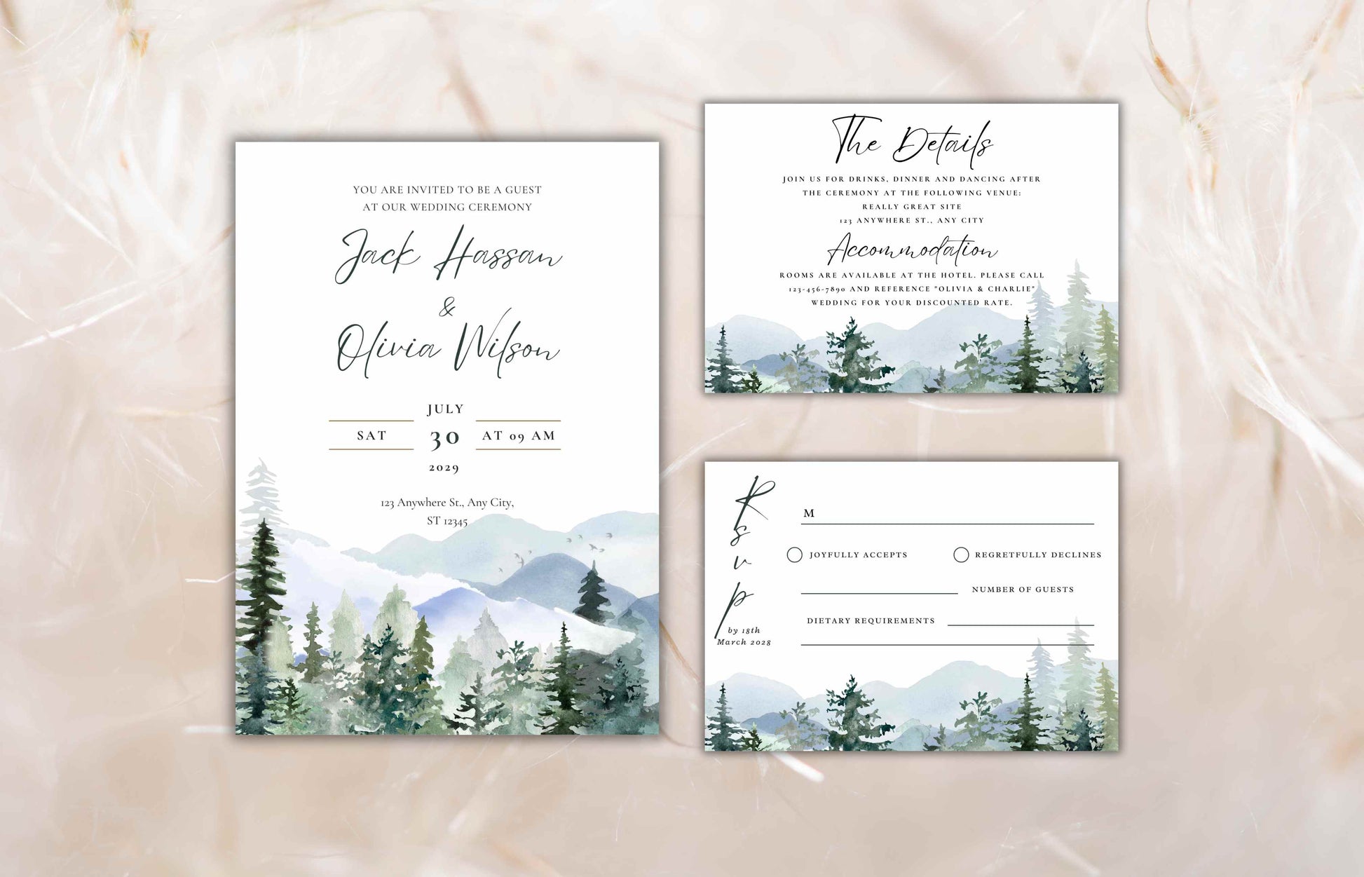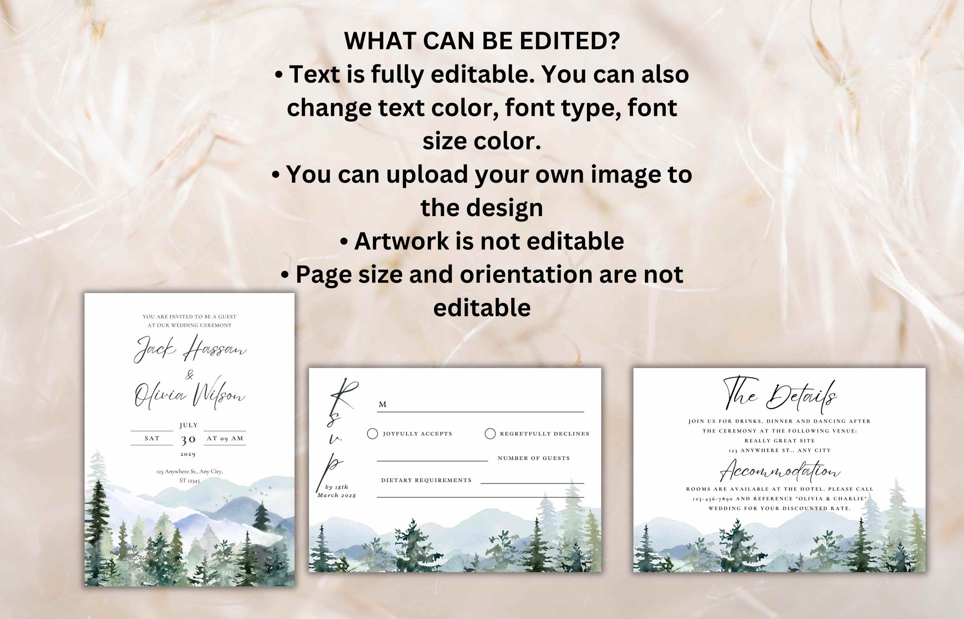 Mountain Wedding Invitation Template Set Pine Tree Wedding Suite, Details Card, Printable RSVP, Outdoor Wedding Invite. WI92