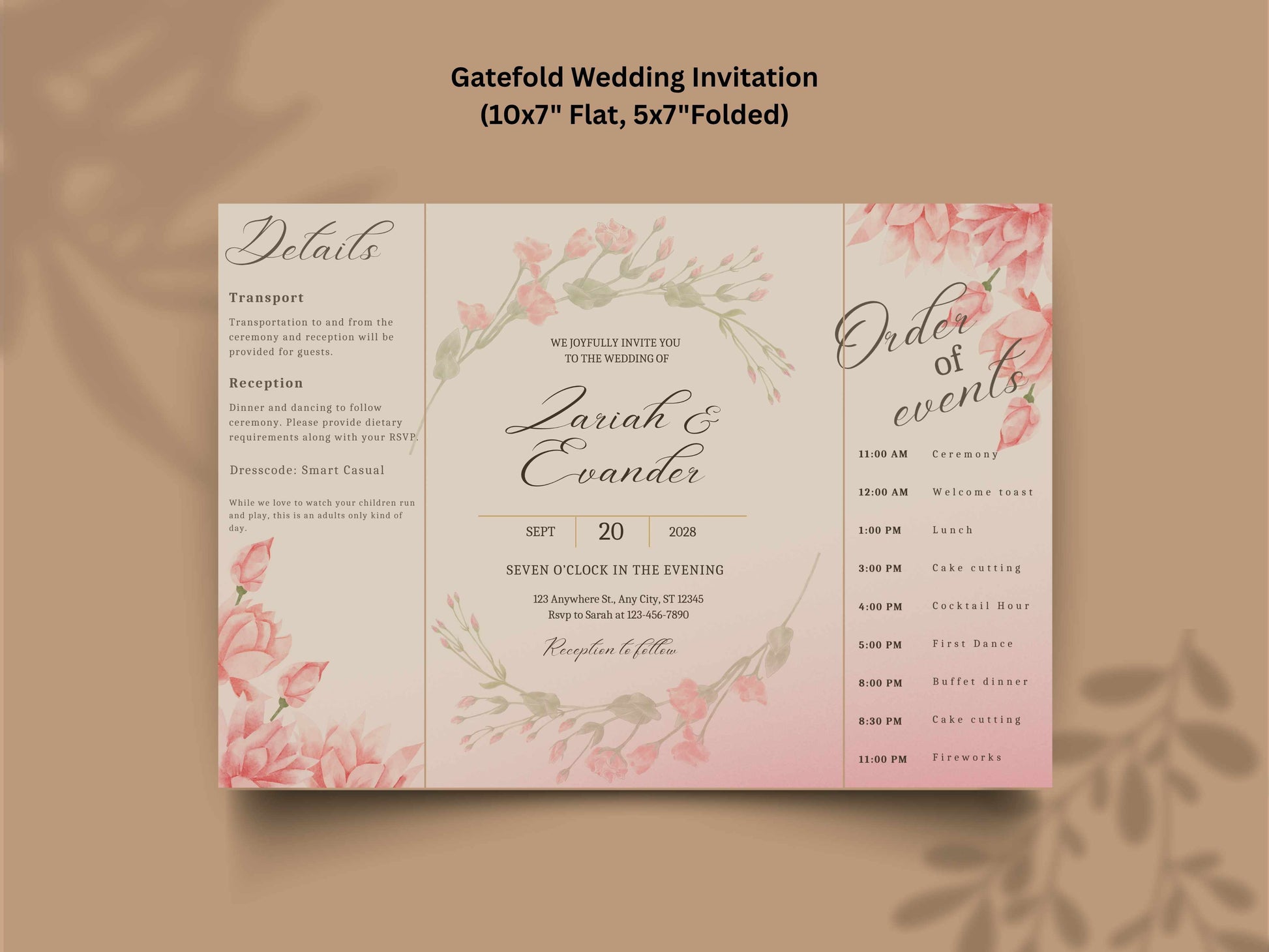 Create a beautiful first impression with this editable gatefold wedding invitation template. Designed with elegant florals, this boho wedding invite is perfect for rustic, garden, or modern wedding themes. The template includes an RSVP card and wedding itinerary timeline for a complete set.