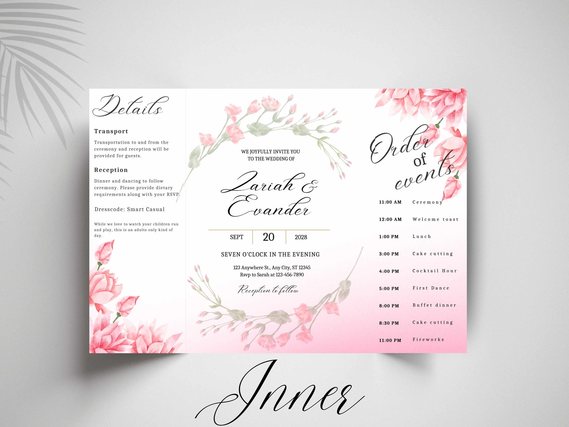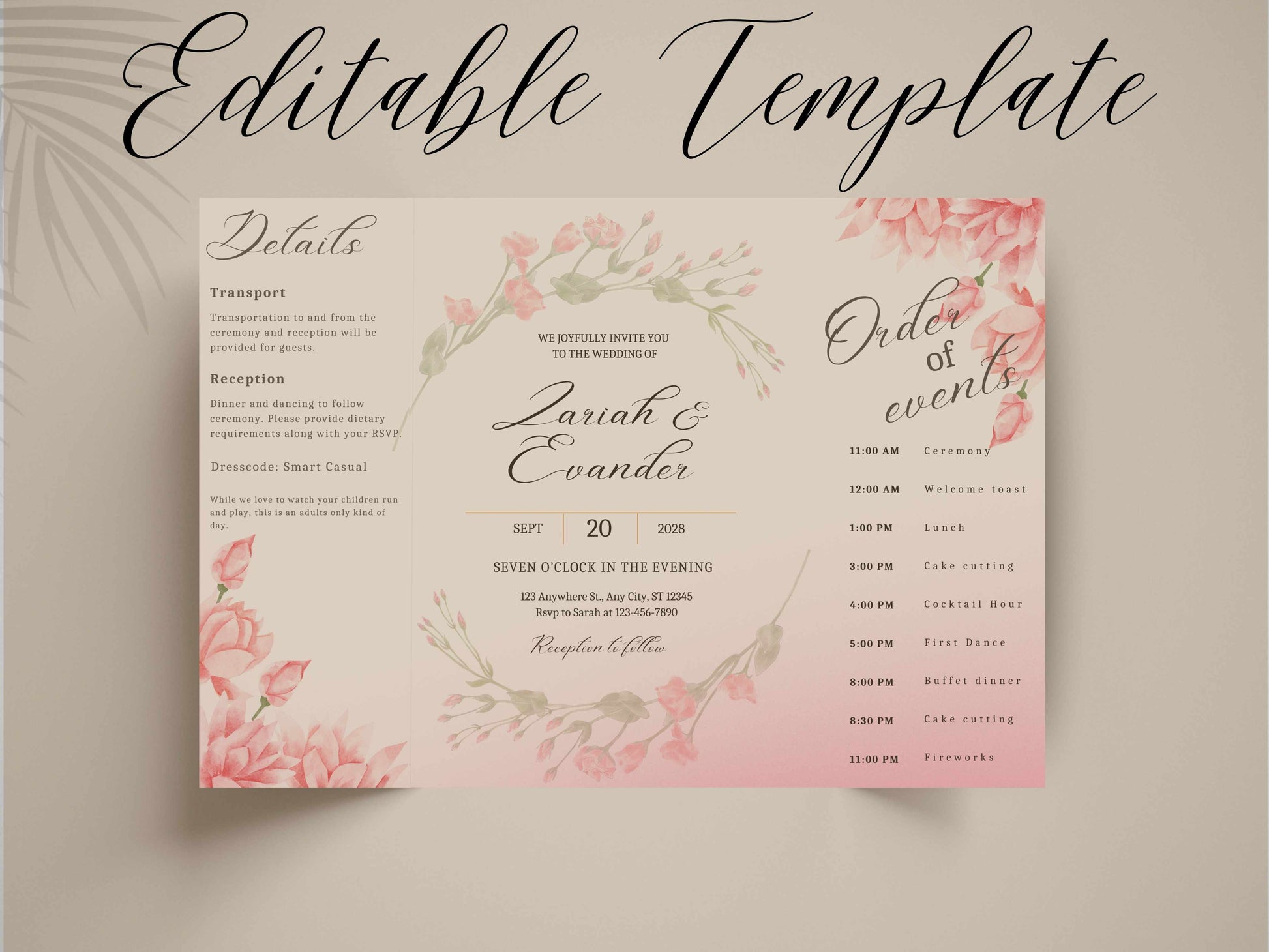 Pink Floral Wedding Invitation Template, Editable Order of Events Card, Modern Wedding Itinerary, Printable Wedding Invite Suite. 171