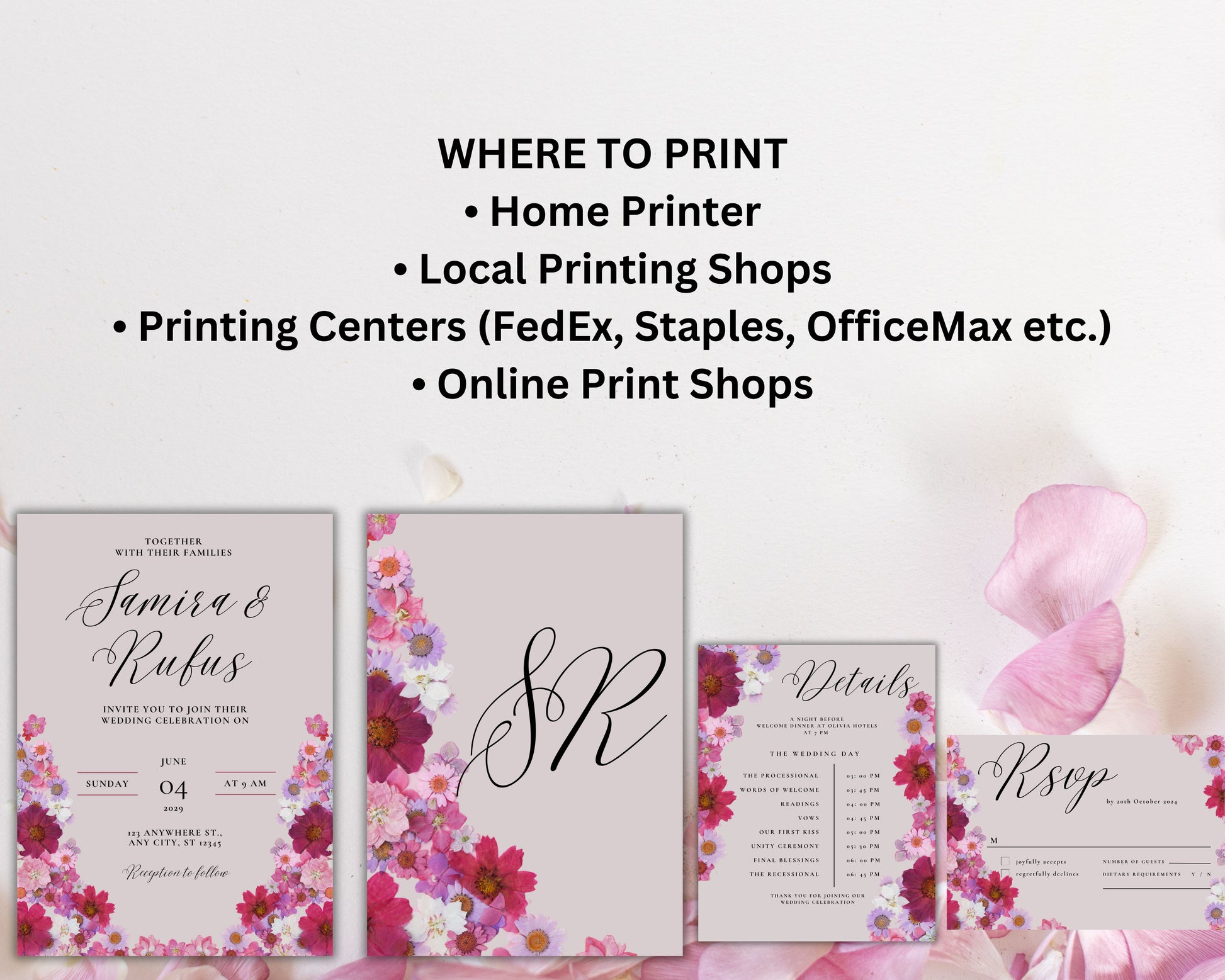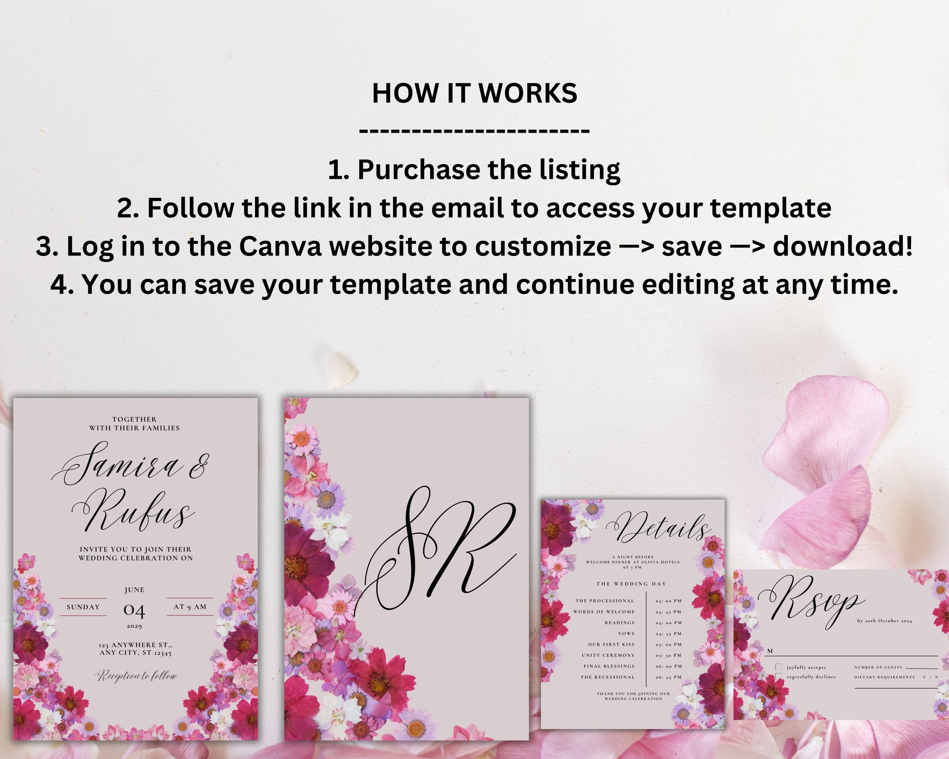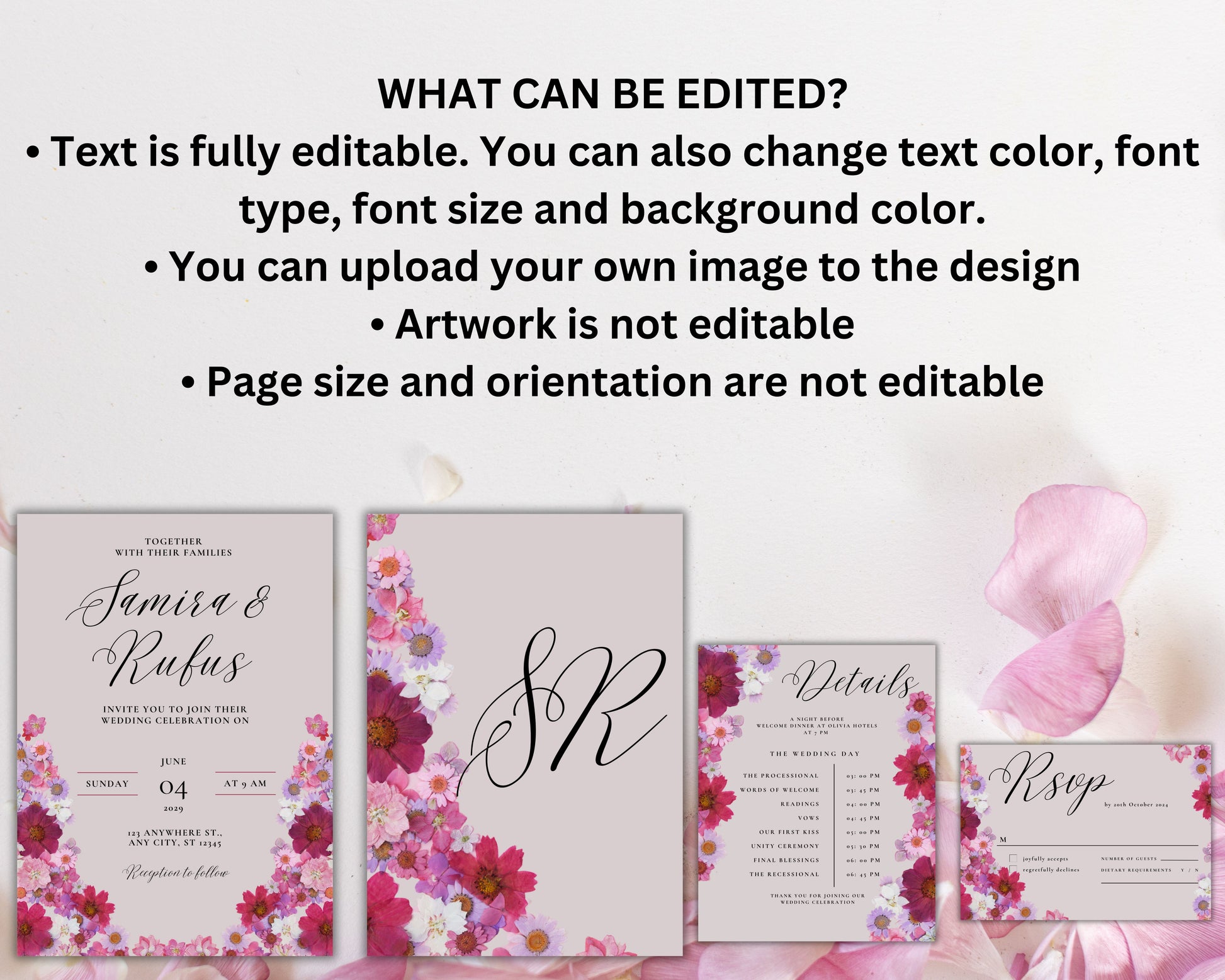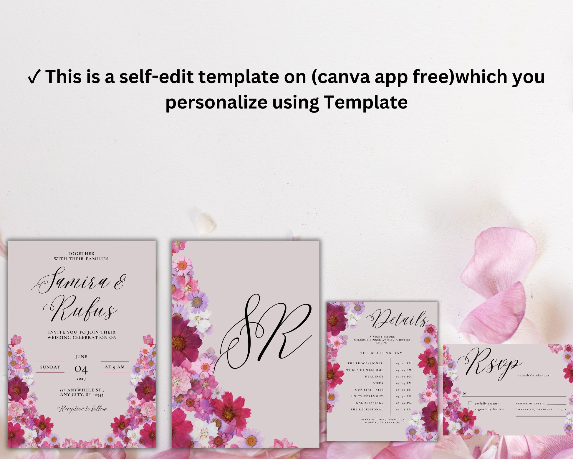Pink Flowers Wedding Invitation set, Pink Floral RSVP, Elegant Pink Rose wedding Invitation, Details , Editable,Template, WT47