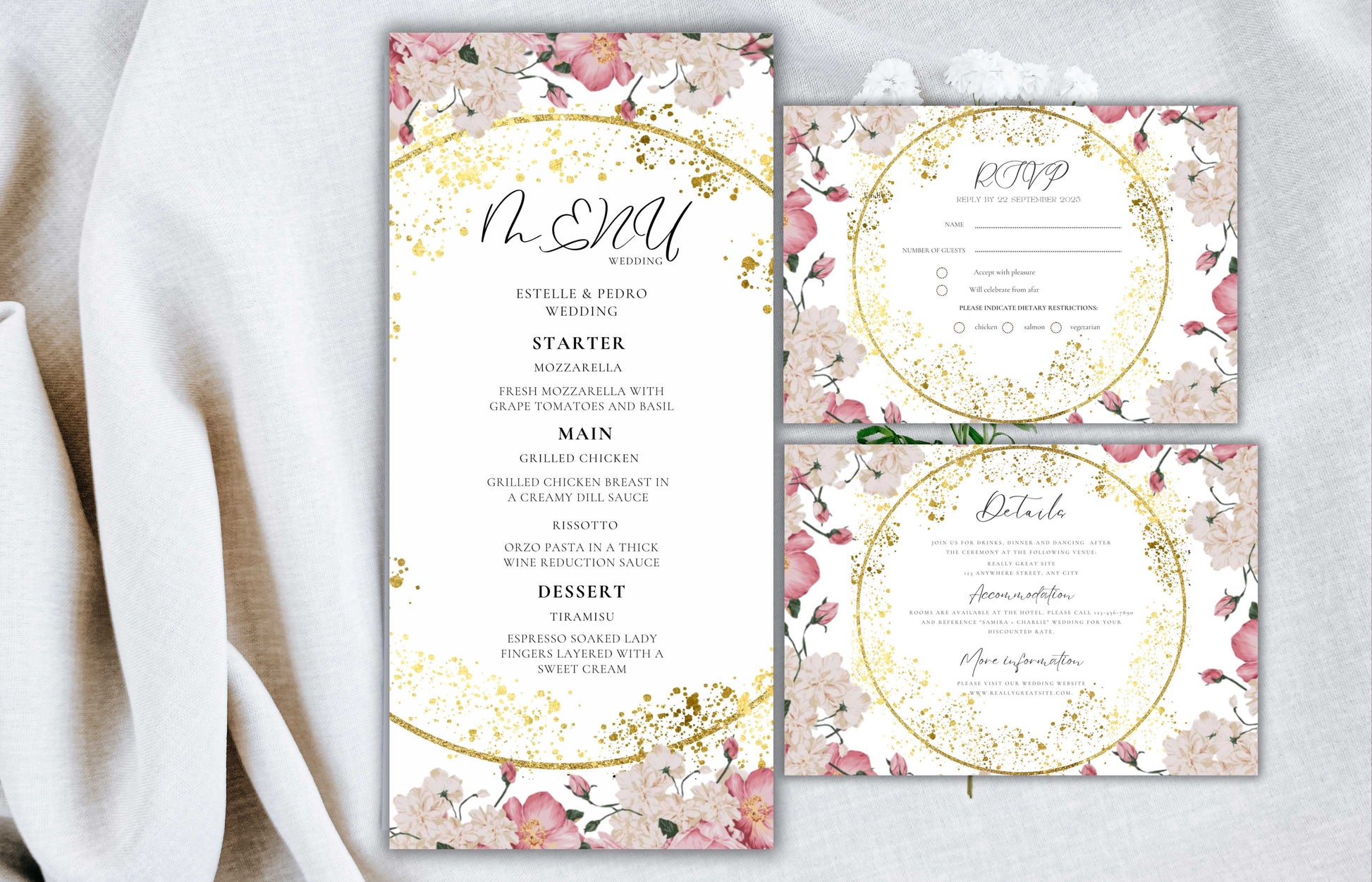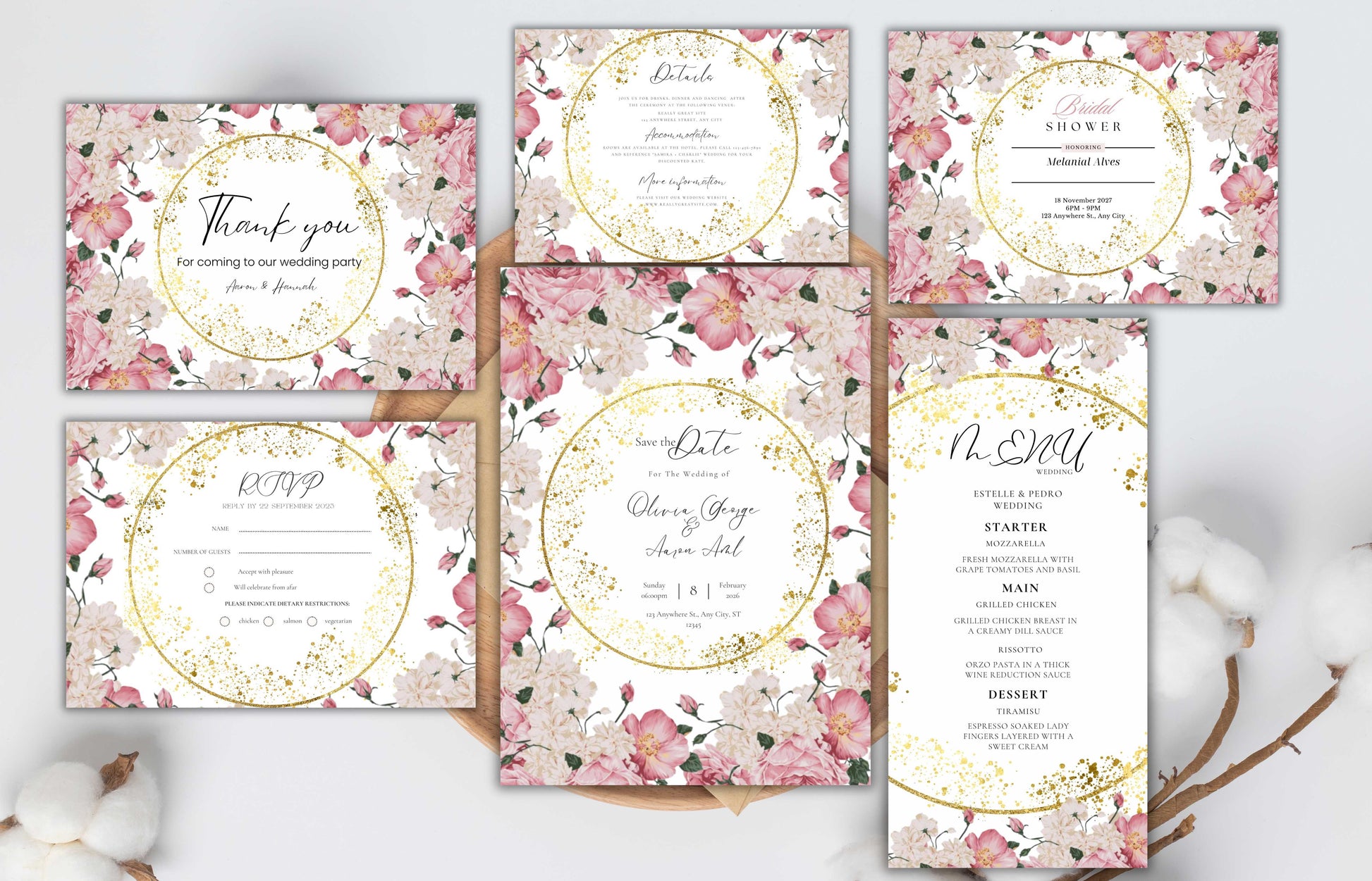 Pink Rose Wedding Invitation Bundle, RSVP, Thank You Card, Pink Rose Bridal Shower, Floral Suite, Party Menu, Details Card, Template, WB2