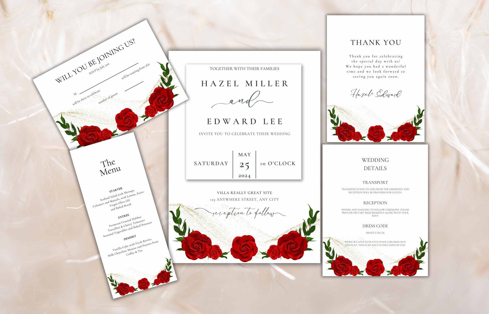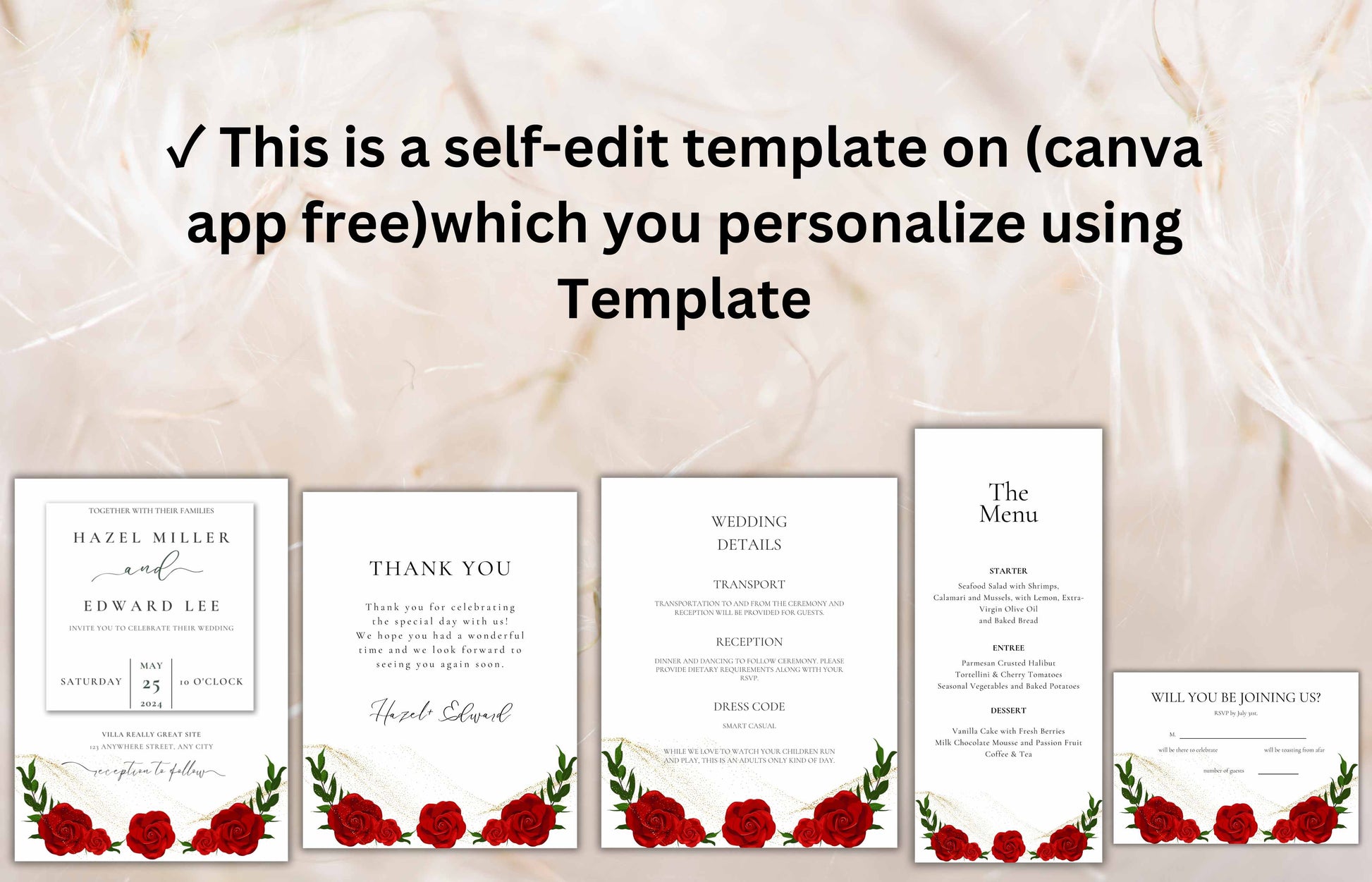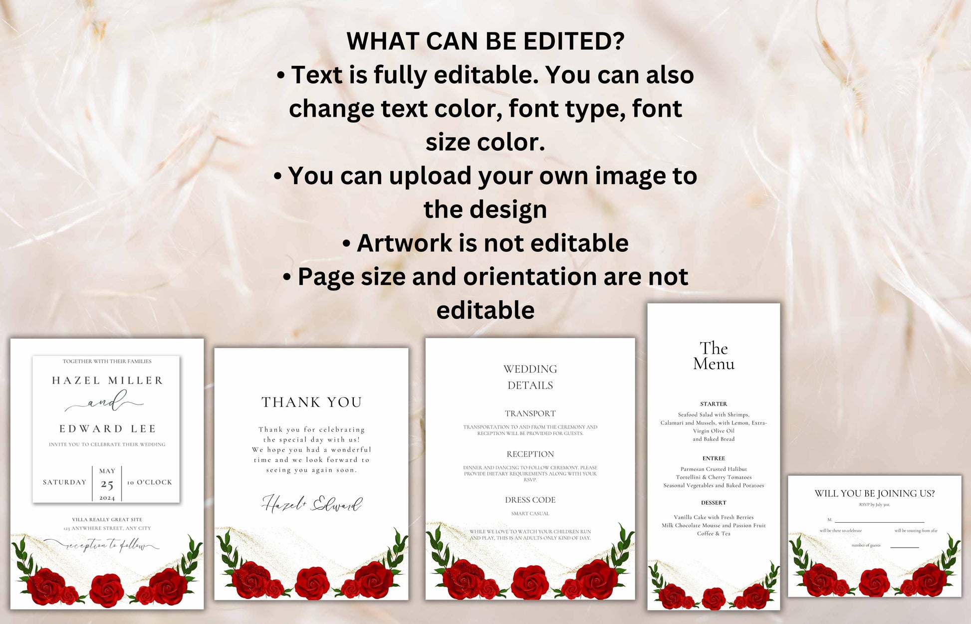 Red Rose Wedding Invitation set, Red Rose RSVP, Dark Red floral, Red Rose wedding Invitation, Details, Menu, Editable, Thank You Card. WIT62