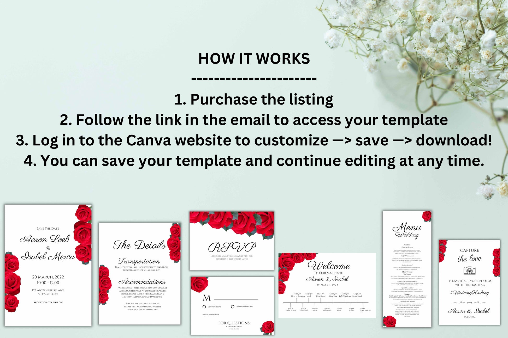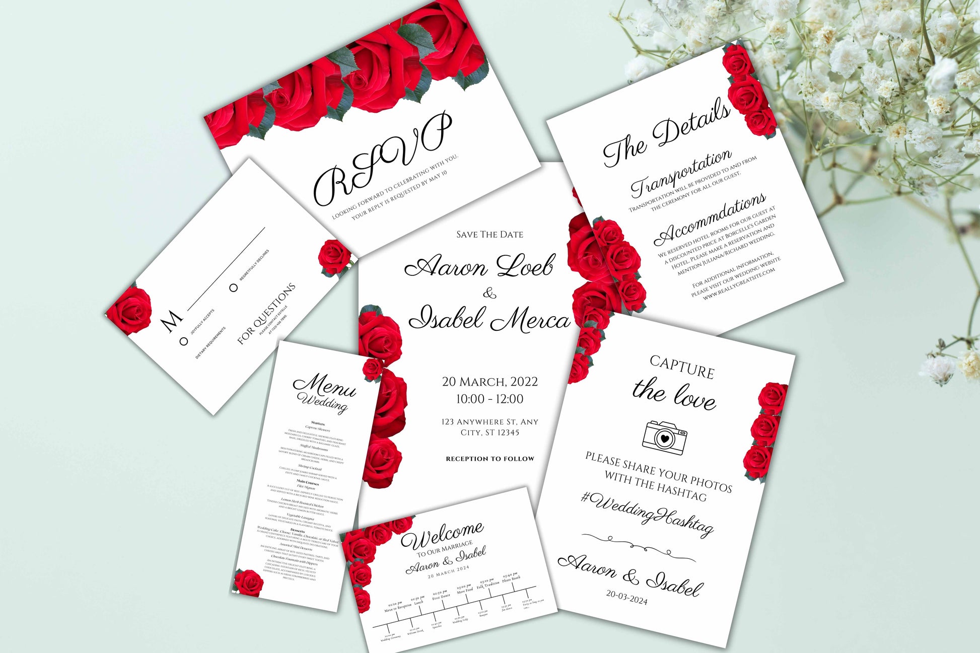 Red Rose Wedding Invitation set, Red Rose RSVP, Welcome Sign, Elegant Red Rose Wedding Timeline, Details Editable, Menu Card, WC40