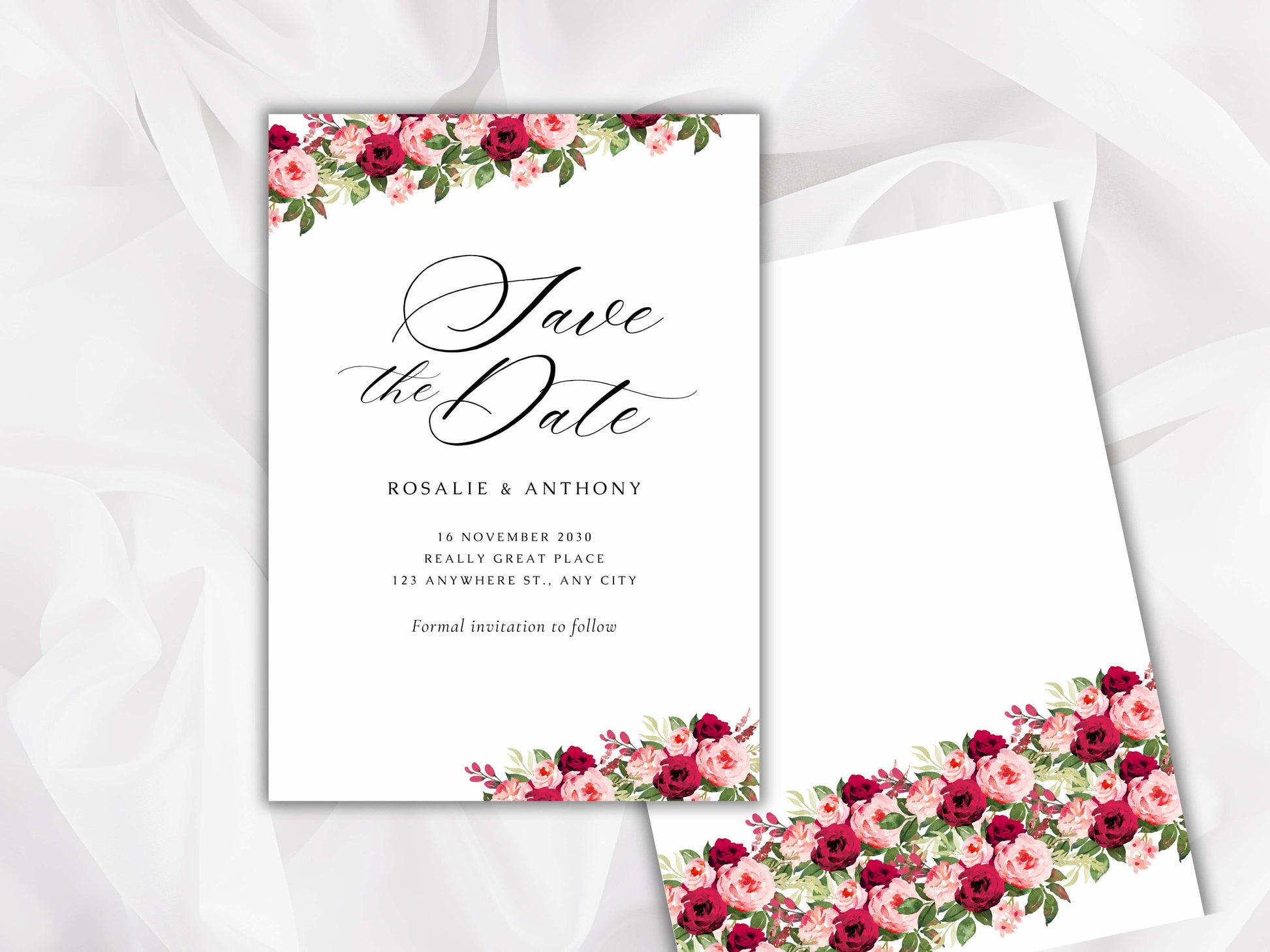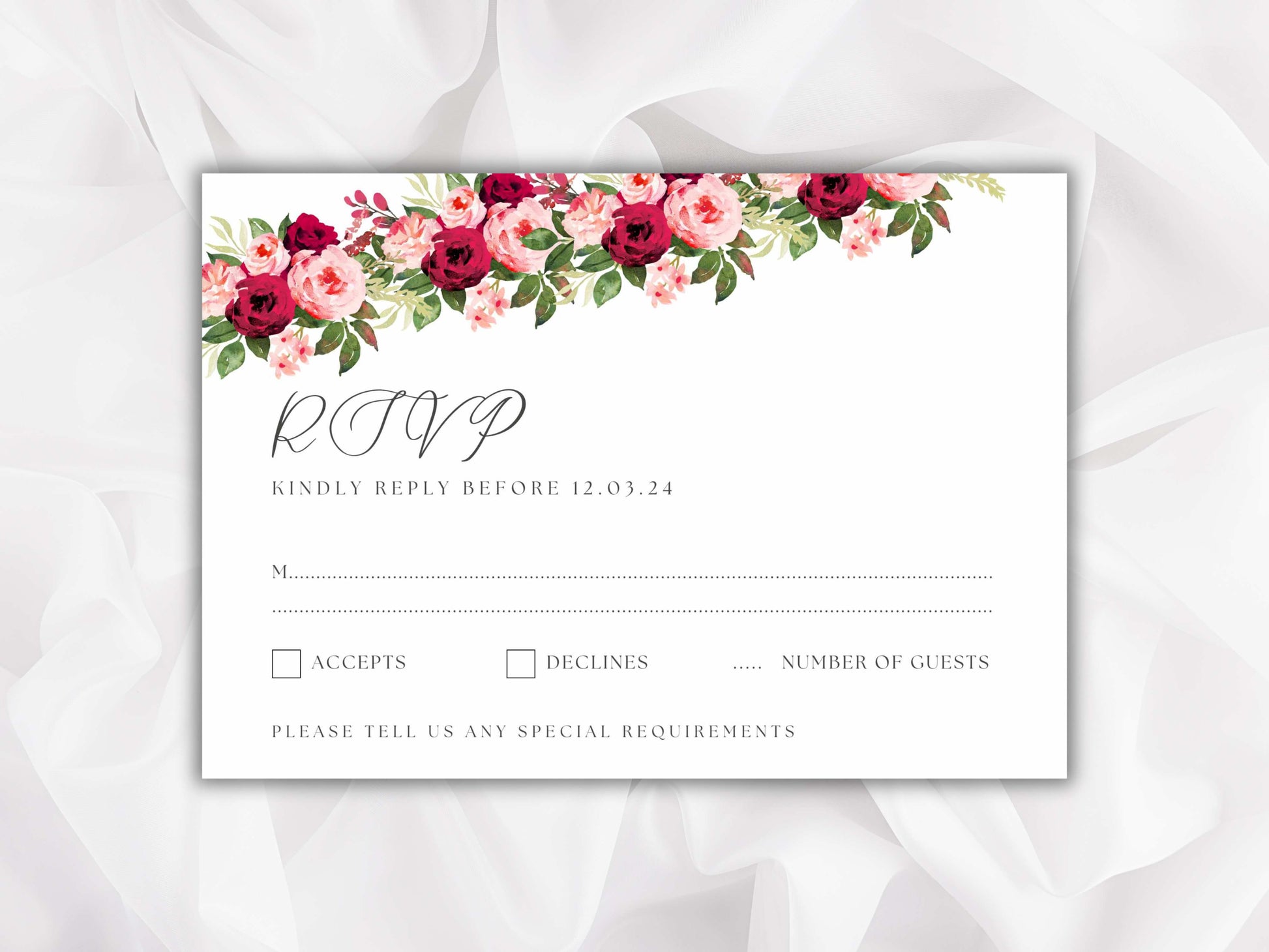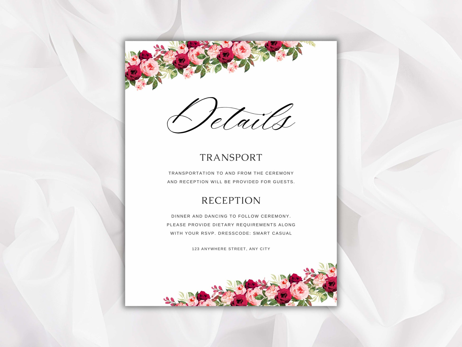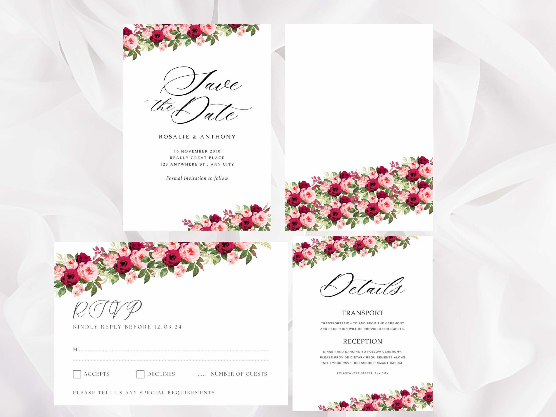 Red wedding invitation template set, printable invite suite editable rsvp details card, pink floral wedding card, wc83