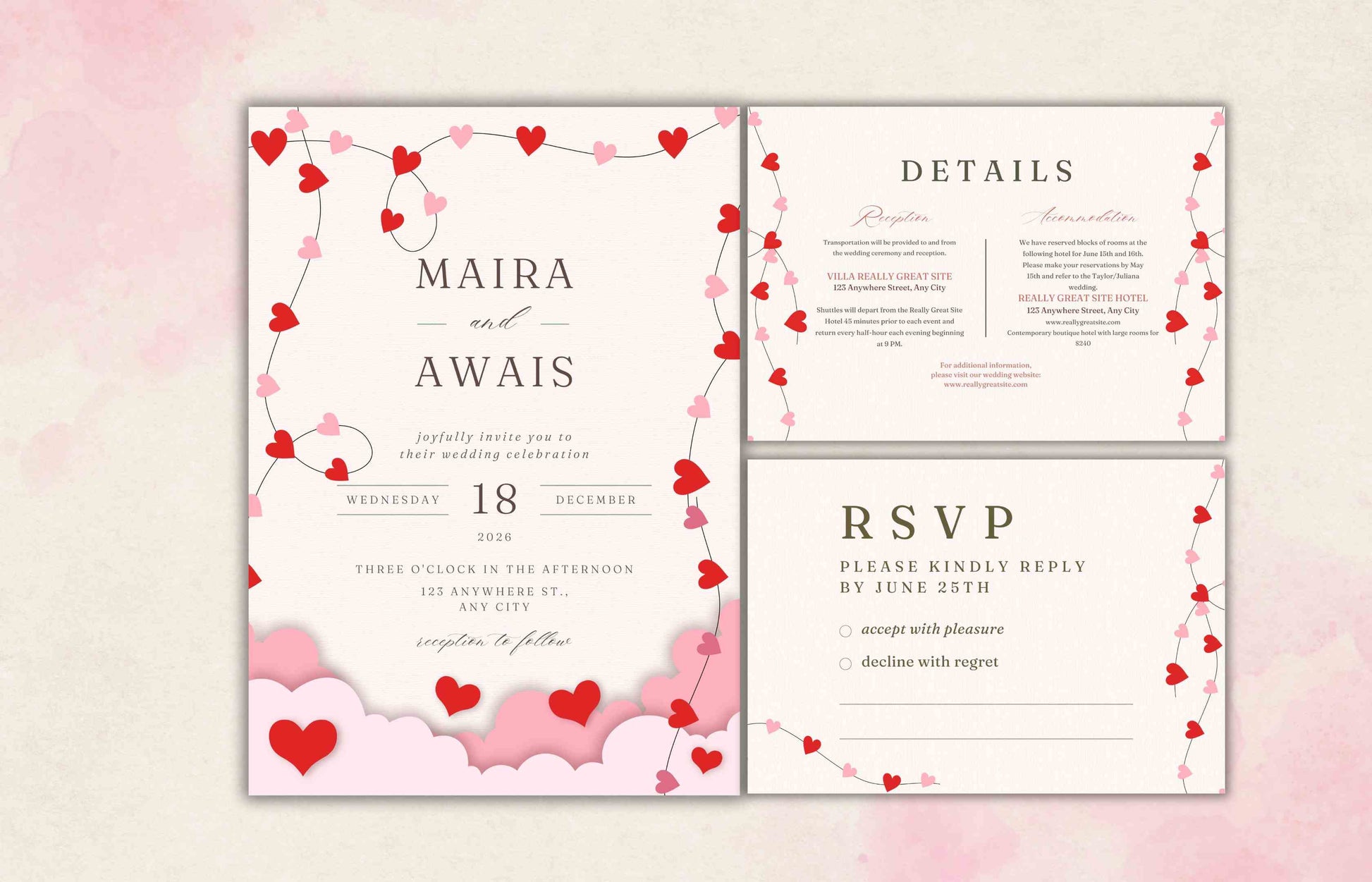 Romantic Wedding Invitation Template, Wedding Invitations Valentine Suite, RSVP, Detail Card, Red Hearts Invitation, Pink Heart Invite. WI97