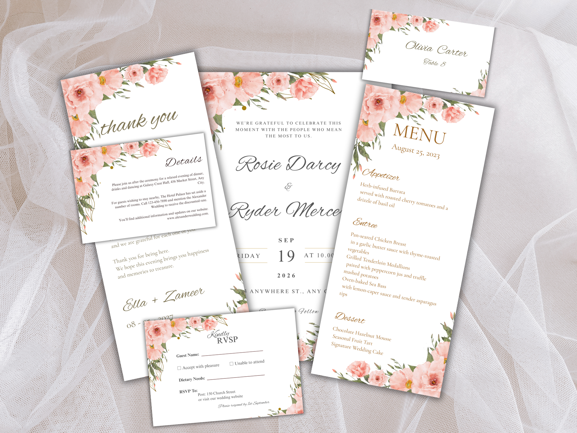 Wedding Invitation Bundle, RSVP, Thank You Card, Table Card, Menu Card, Reception Card, Details Card. WI226